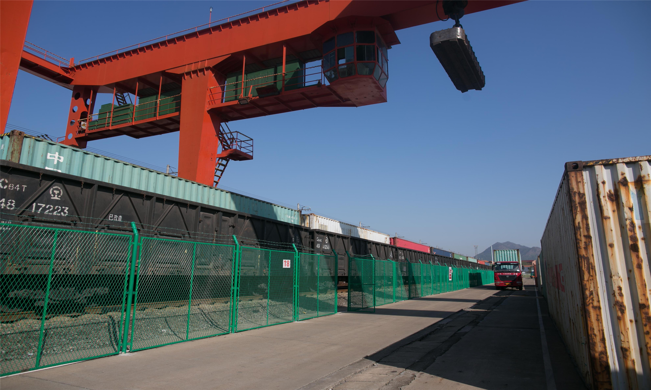 A freight train loaded with containers pulls out of Yiwu West Railway Station on December 5, 2014 on the newly-built Yiwu-Xinjiang-Europe line. According to Cai Qinliang, deputy head of the Yiwu Christmas Products Association, sales this year were average. Although overseas orders dropped, there was an increase in domestic sales. Photo: Chen Ronghui