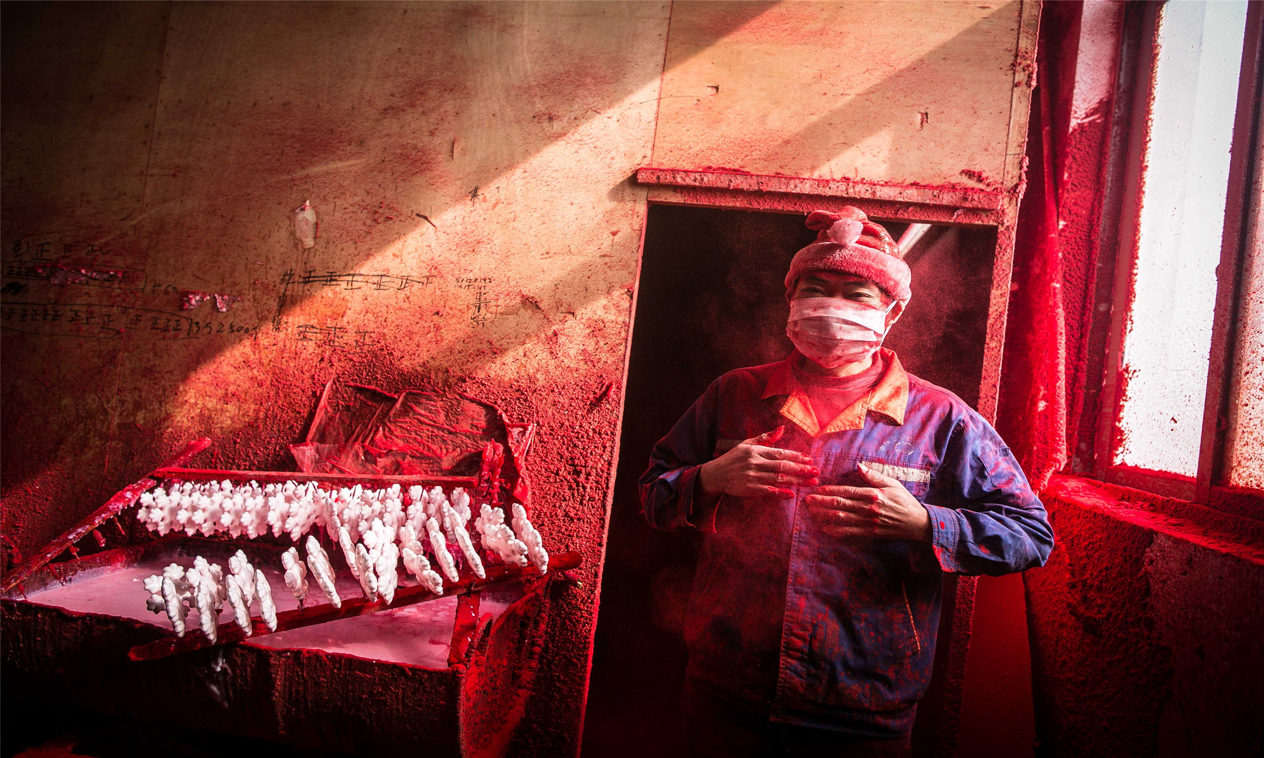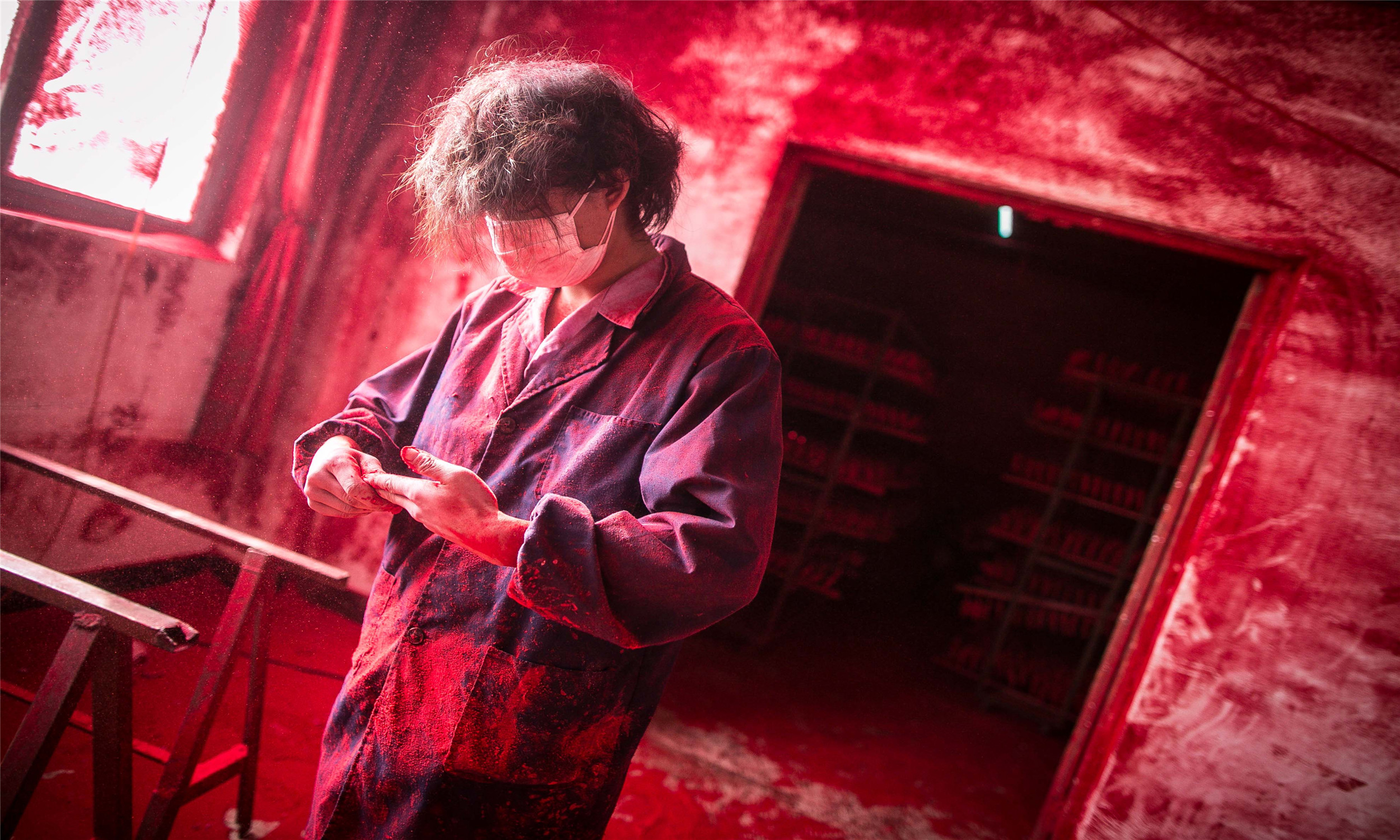 Wei dusts himself off after exiting the drying room. The 60-square meter workshop is completely covered with red powder. Any that falls on the floor is eventually recycled. Photo: Chen Ronghui