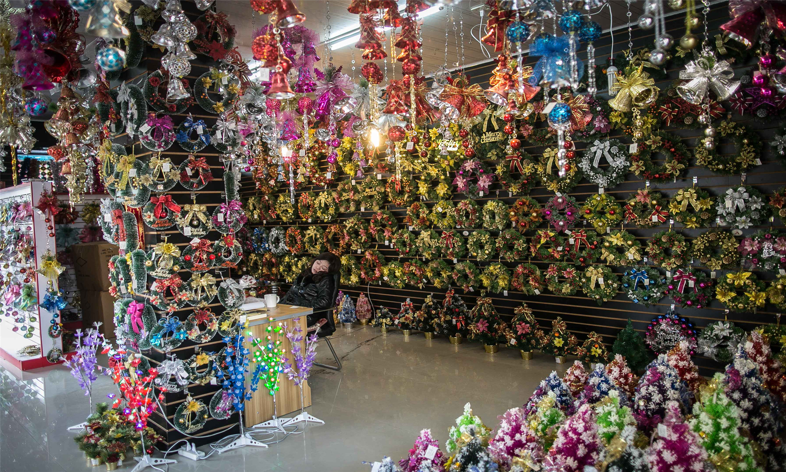 Christmas decorations are displayed outside a shop at the Futian Market in Yiwu, Zhejiang Province on December 4, 2014. The city has been dubbed the "Christmas Village of China" for its 600 factories which manufacture millions of Christmas decorations every year. The city produces 60 percent of the world's Christmas ornaments. Photo: Chen Ronghui