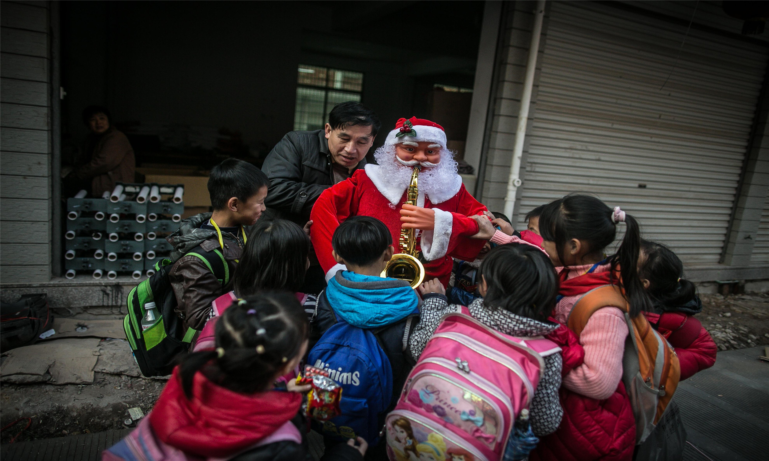 Young students gather around an ornament maker surnamed Gao and his sax-playing Santa Claus statue outside his shop. Gao, 50, makes around 40 of the statues each day with his wife. Gao said they have made less this year and now they take occasional online orders. Most parents of the students also work in nearby factories. Photo: Chen Ronghui