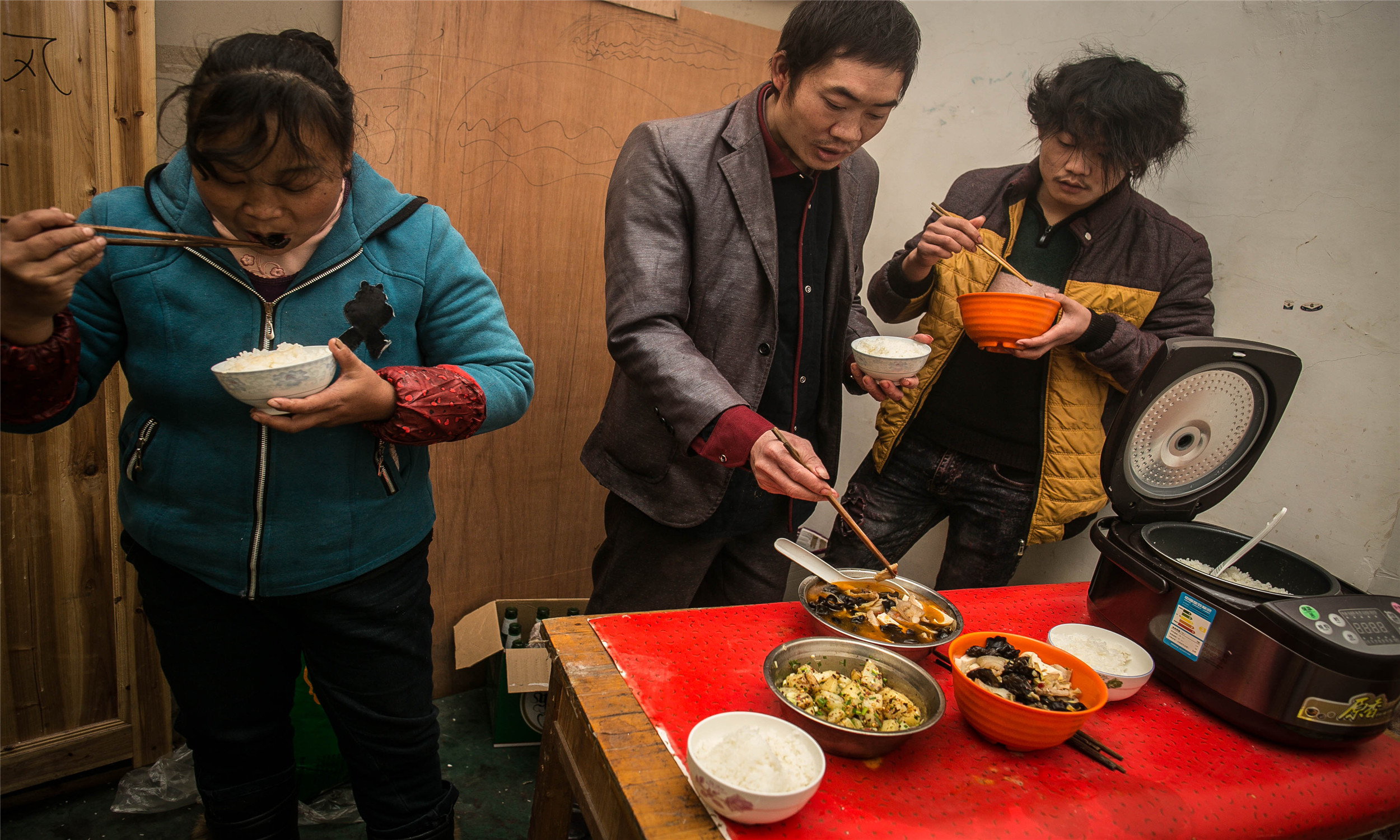 Wei (middle) eats lunch with his wife and son. Wei's wife, who works in the installation department, normally heads home first to prepare lunch for the family. Wei said the family might not stay with the factory next year, because the work is too hard. They are planning to return to their hometown after saving enough money for their sons. Photo: Chen Ronghui
