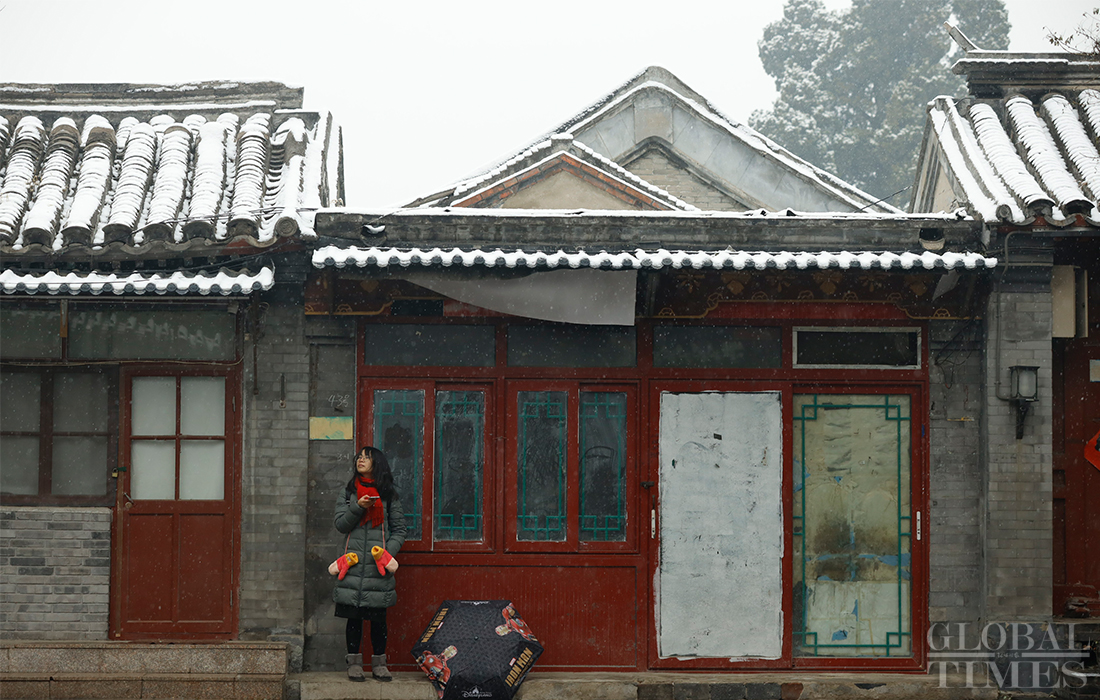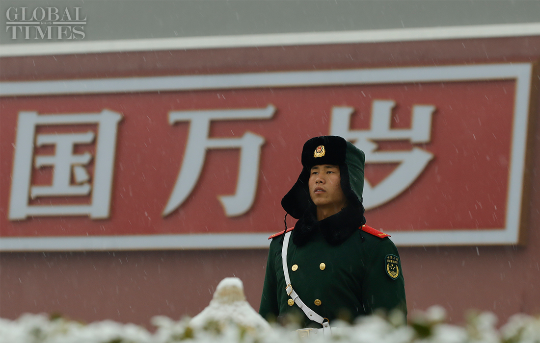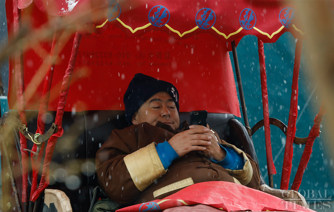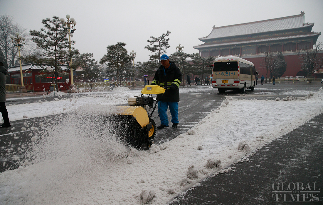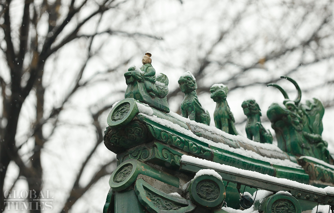 Beijing on Monday was blanketed in white after experiencing the second snow this winter. Visitors were seen enjoying the snow and taking pictures in Tiananmen Square, Jingshan Parkand other popular spots. The Beijing Meteorological Service issued a blue alert for blizzards on Sunday, the first blizzard alert for this winter. Photos: Li Hao/GT