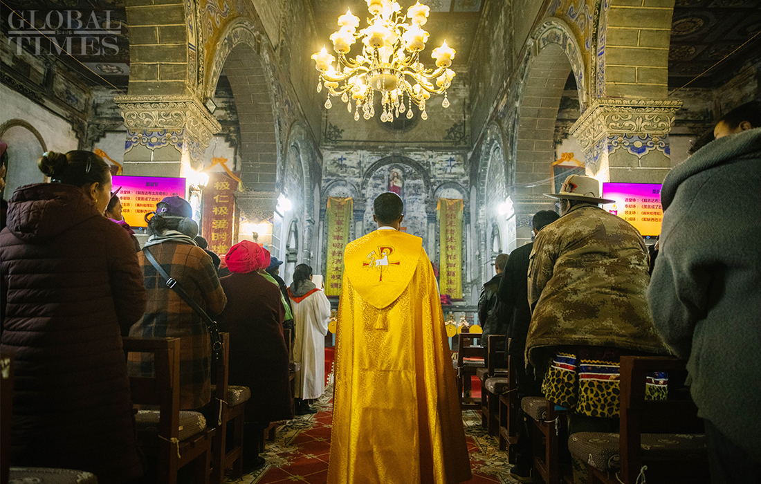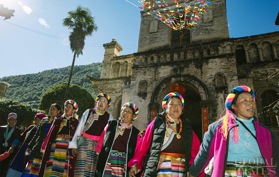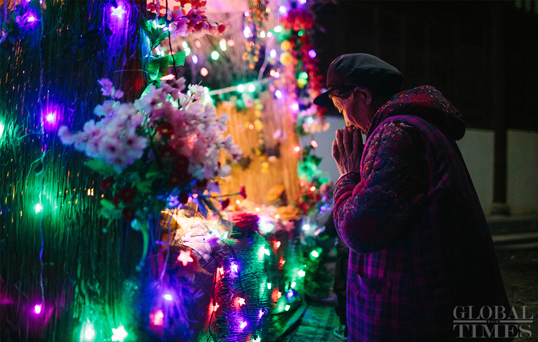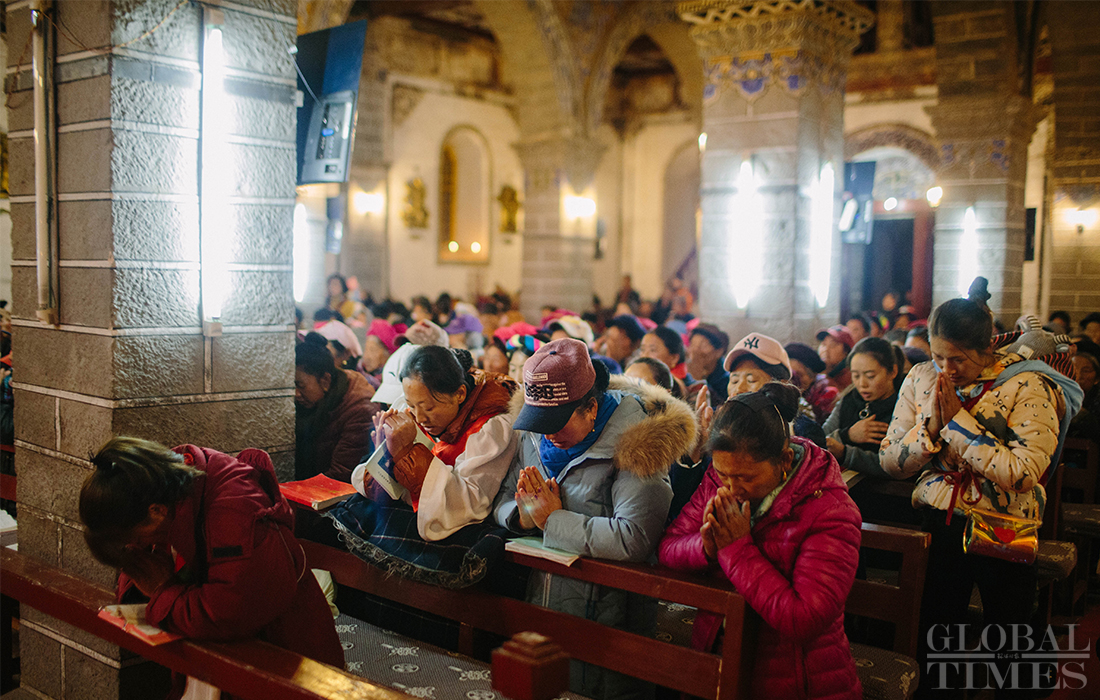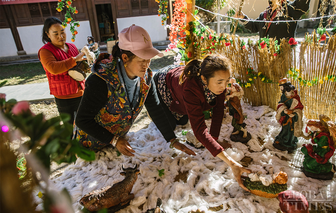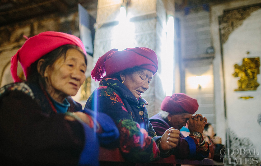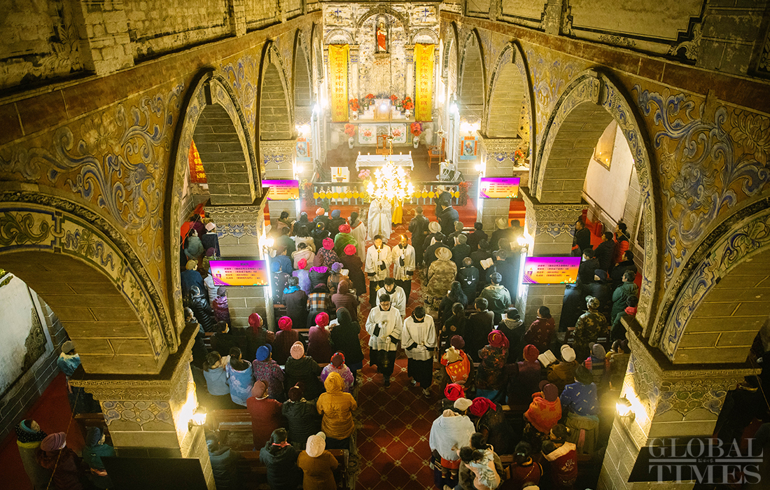 Christians in Cizhong village in Diqing Tibetan Autonomous Prefecture in South West China’s Yunnan Province celebrated Christmas on Tuesday and Wednesday. The remote village, which is surrounded by mountains, is a melting pot of multicultural communities fostering residents belonging to three religions and seven ethnic groups. Among its 1,331 residents, 40 percent are Catholics, 35 percent believe in Buddhism and 5 percent are Dongba, an ancient religion of the Naxi people. In early 1990s, French preachers for the first time introduced the Catholic religion among the locals. The Gothic-style Cizhong Church is listed as a nation-level relic. Photos: Li Hao/GT