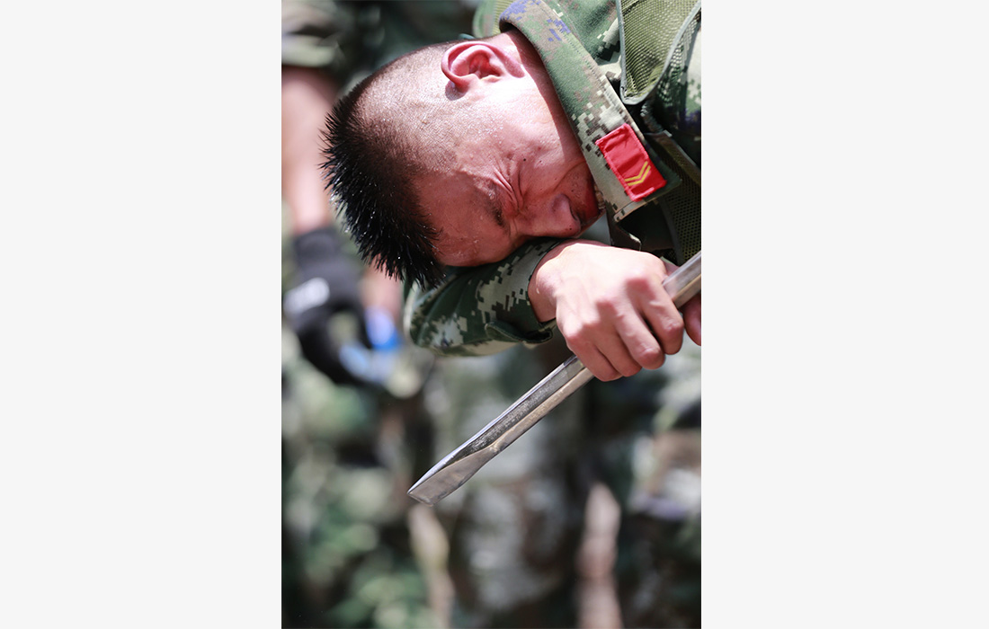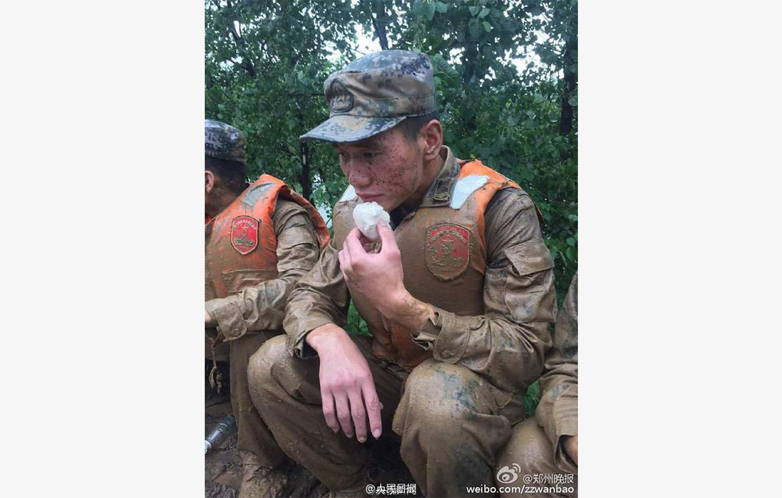 A soldier covered head to toe in mud takes a break from fighting the flood. Photo: People’s Daily on Weibo.com figcaption >