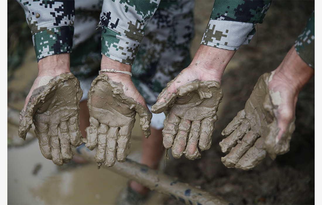 Workers show off their muddy hands after conducting urgent electrical repairs in Hunan Province’s Xiangxi, on June 26. Photo: CFP figcaption >