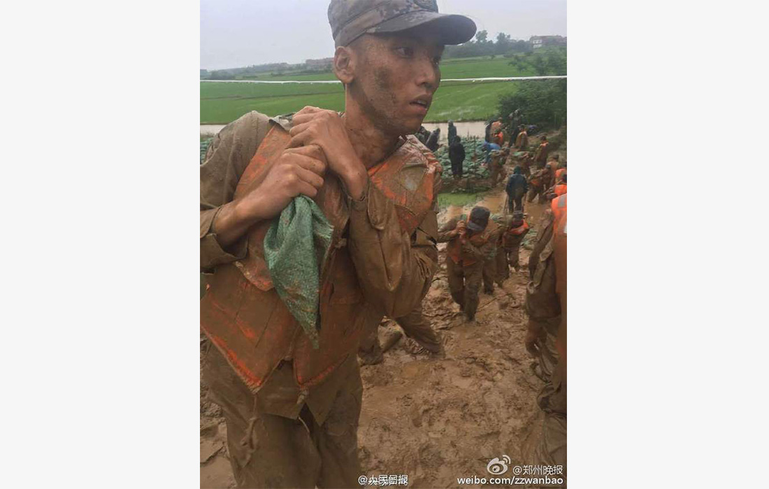 Soldiers carry bags to help stop the spread of the flood. Photo: People’s Daily on Weibo.com figcaption >
