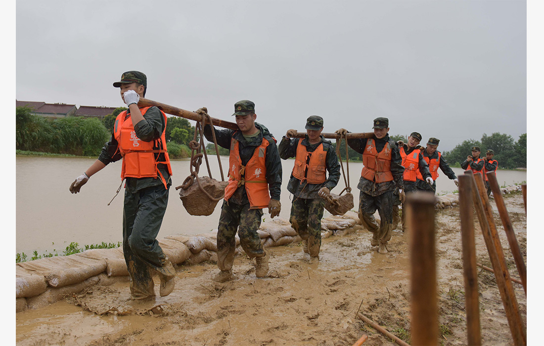 Soldiers transport bags of stones to a dam along the Yangtze River in Lujiang county, Anhui Province’s Hefei, on July 5. Photo: CFP figcaption >
