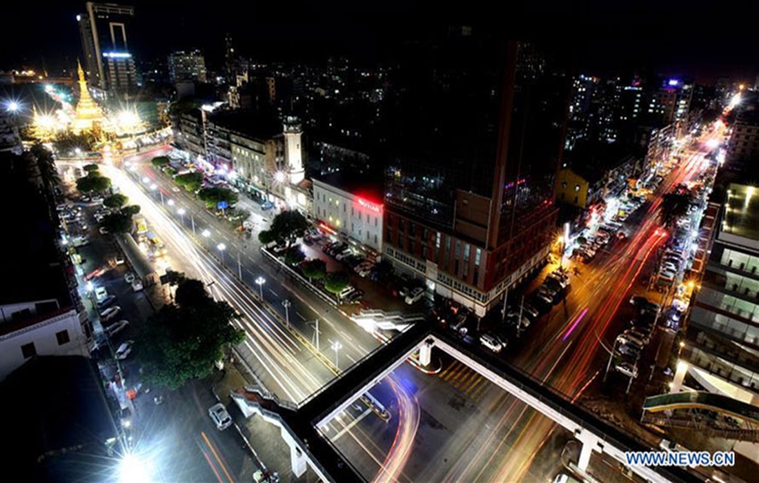 Central Yangon, Myanmar bustles on a night. (Photo: Xinhua) figcaption >