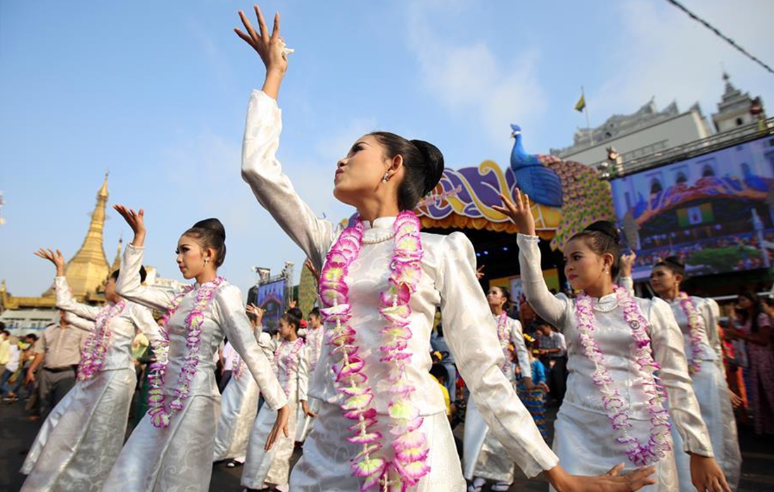 Dancers perform during the traditional Thingyan water festival in Yangon, Myanmar on April 13, 2019. (Photo: Xinhua) figcaption >