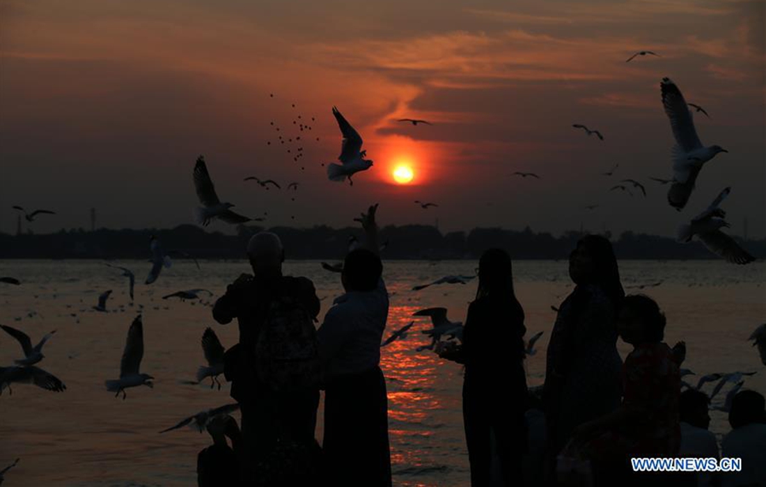 Visitors look at gulls flying over the Yangon River during the last sunset of 2019 at Botahtaung harbour in Yangon, Myanmar. (Photo: Xinhua) figcaption >