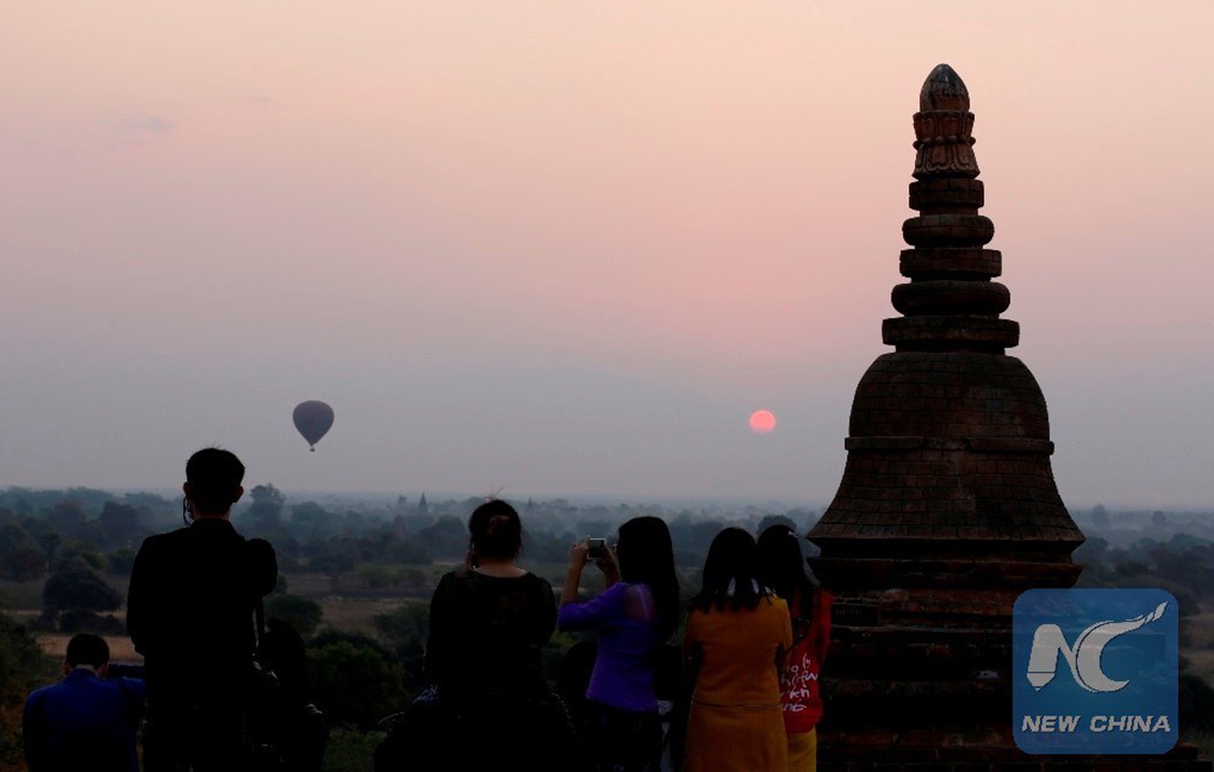 Visitors enjoy a sunrise in Myanmar's ancient city of Bagan.(Photo: Xinhua) figcaption >