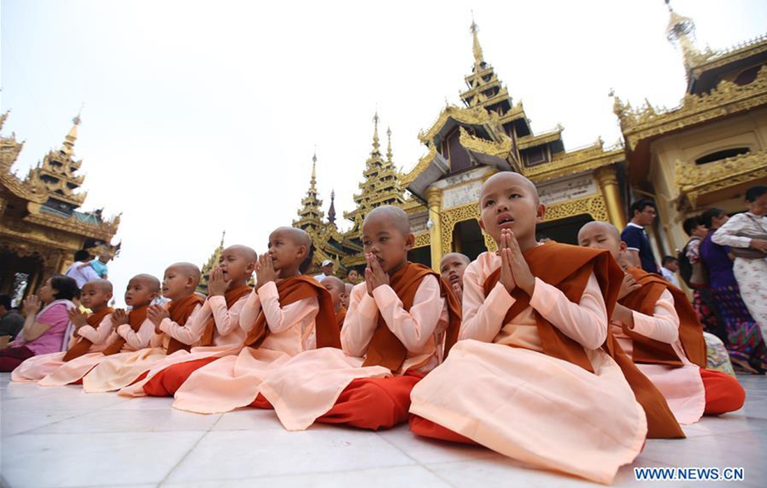 Young Buddhist nuns pay homage at the world-famous Shwedagon Pagoda on the first day of Myanmar's traditional new year in Yangon, Myanmar on April 17, 2018. Myanmar is the most religious Buddhist country in terms of the proportion of monks in the population and the proportion of income spent on religion. (Photo: Xinhua) figcaption >