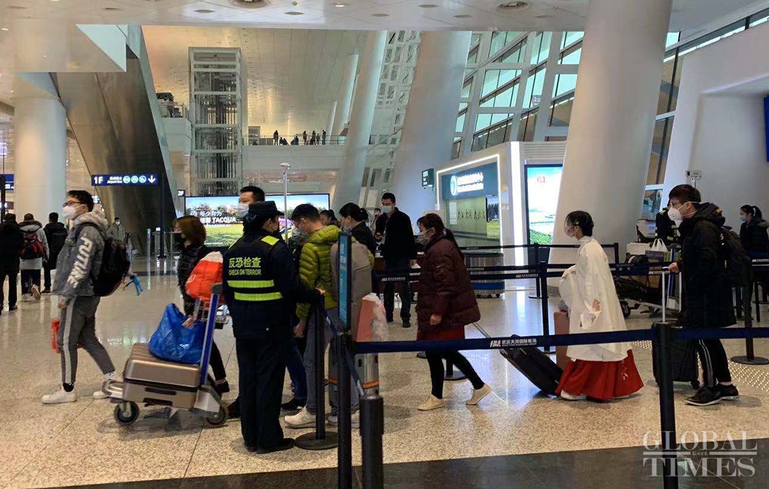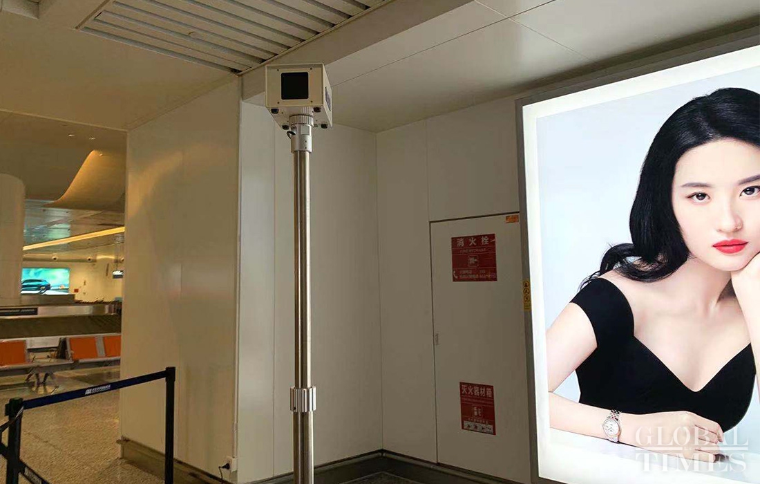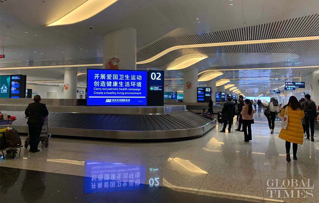 Body temperature screening devices installed at different entry/exit points of the Wuhan airport. “Carry out patriotic health campaign” notices can be seen on the premises. Almost all passengers wear masks as the city is the key epidemic control zone. Photos: Chen Qingqing/GT