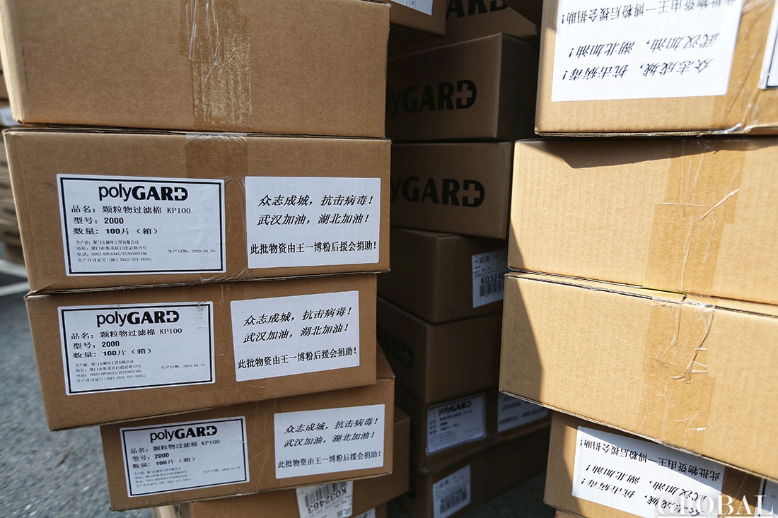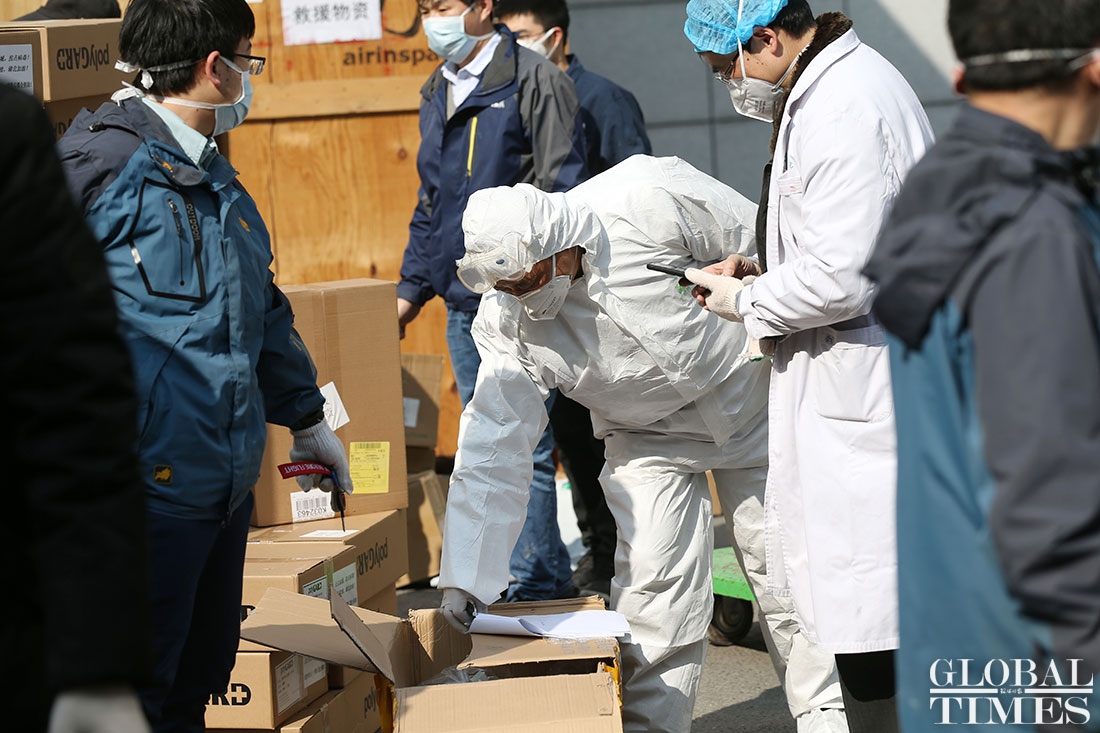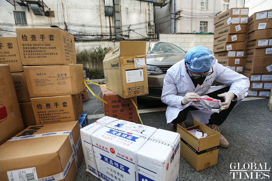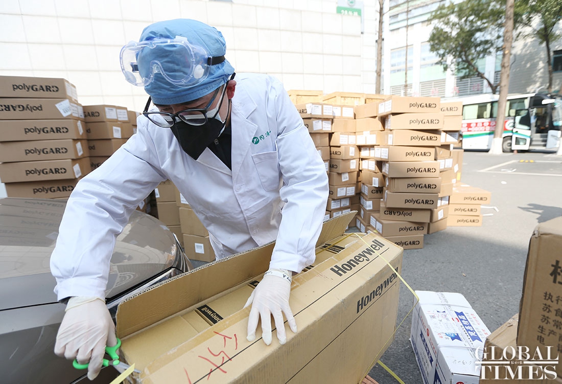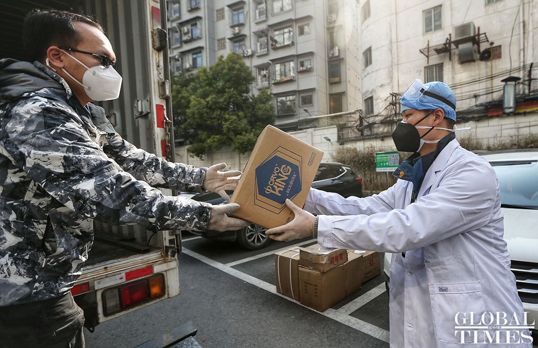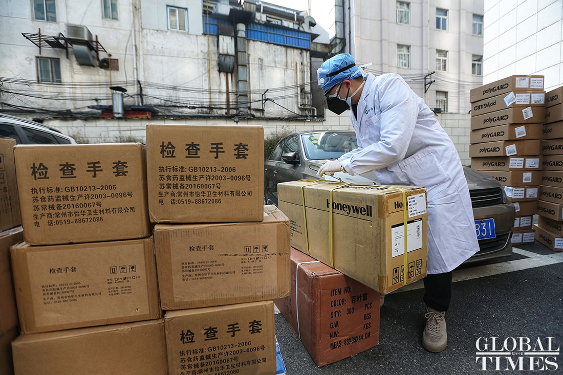 A batch of donated supplies from areas of China including Guangdong and Beijing arrive at Wuhan Tongji Hospital amid the outbreak of the novel coronavirus. Stickers offering support to Wuhan can be seen on the boxes as they arrive. Photos: Cui Meng