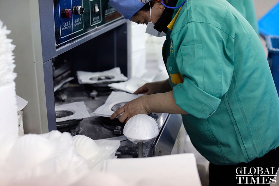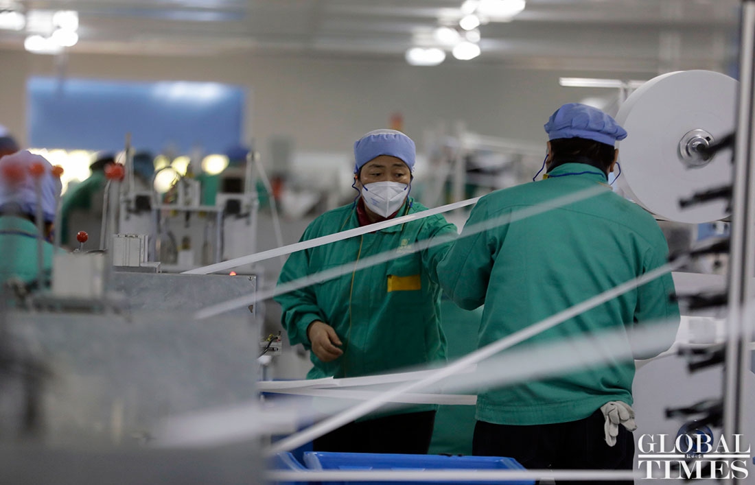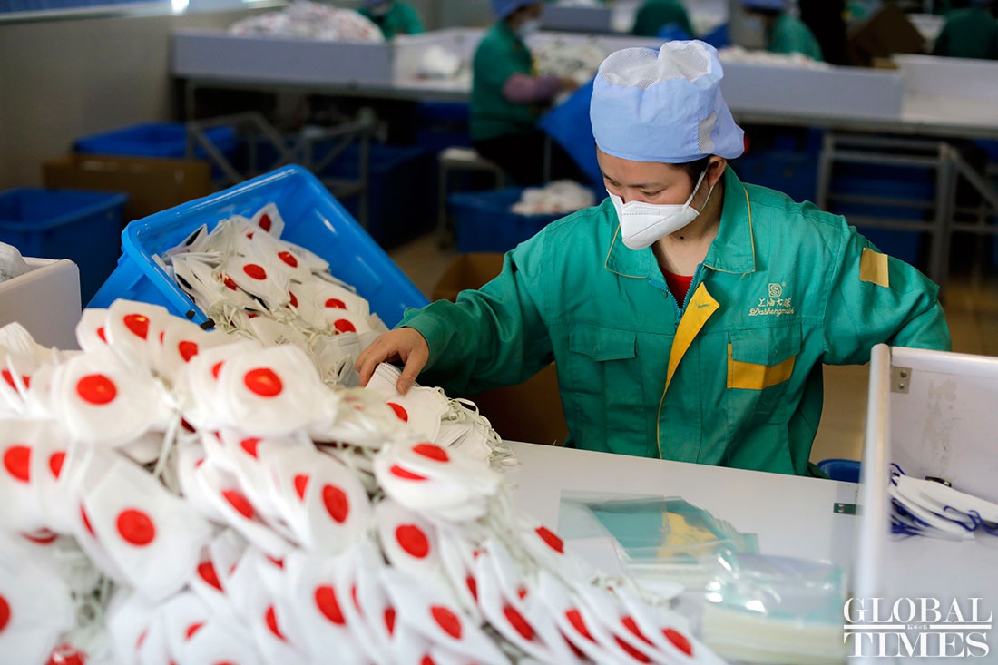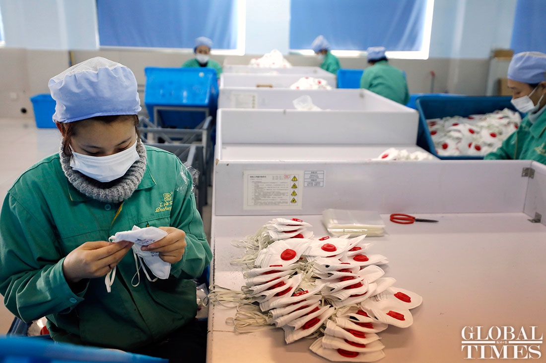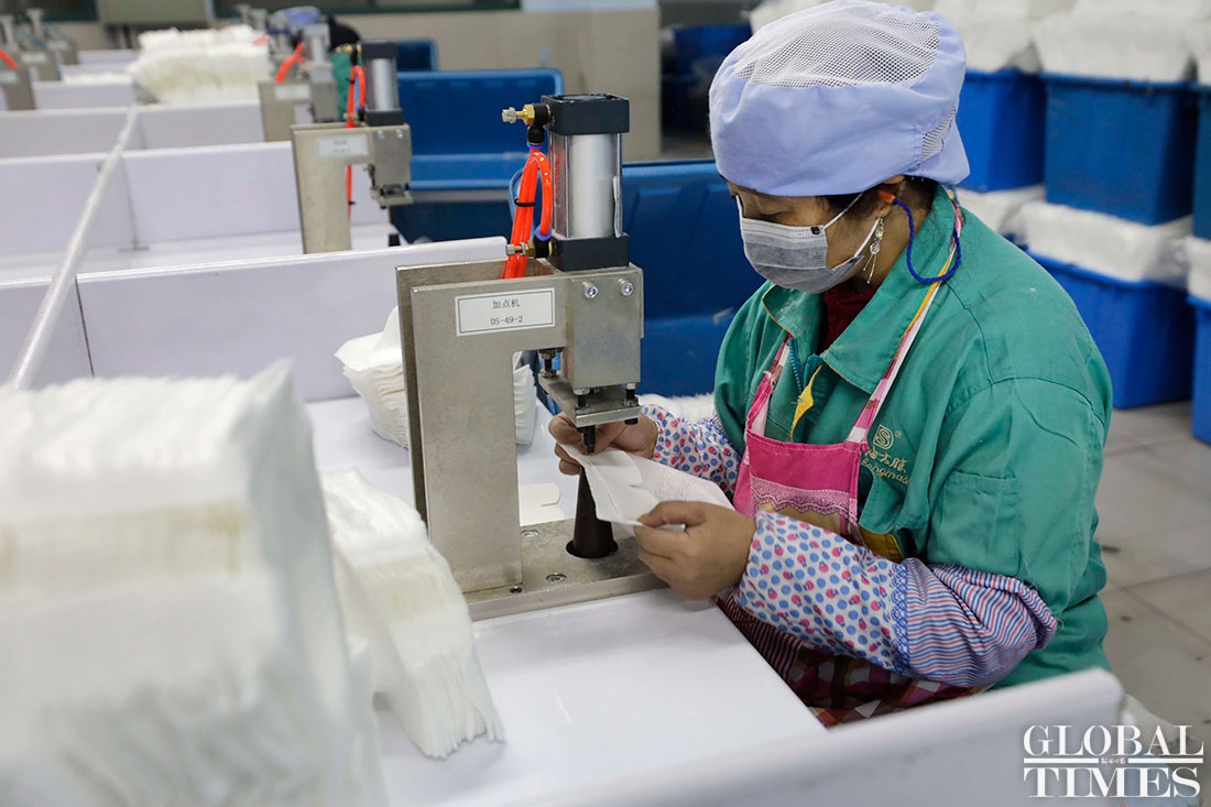 The production line at Shanghai Dasheng Health Products Manufacture Co is running 24 hours a day to produce protective facial masks amid a shortage of medical equipment in China, which is tackling the coronavirus outbreak. The factory can produce about 80,000 masks every day. Photos: Yang Hui/GT
