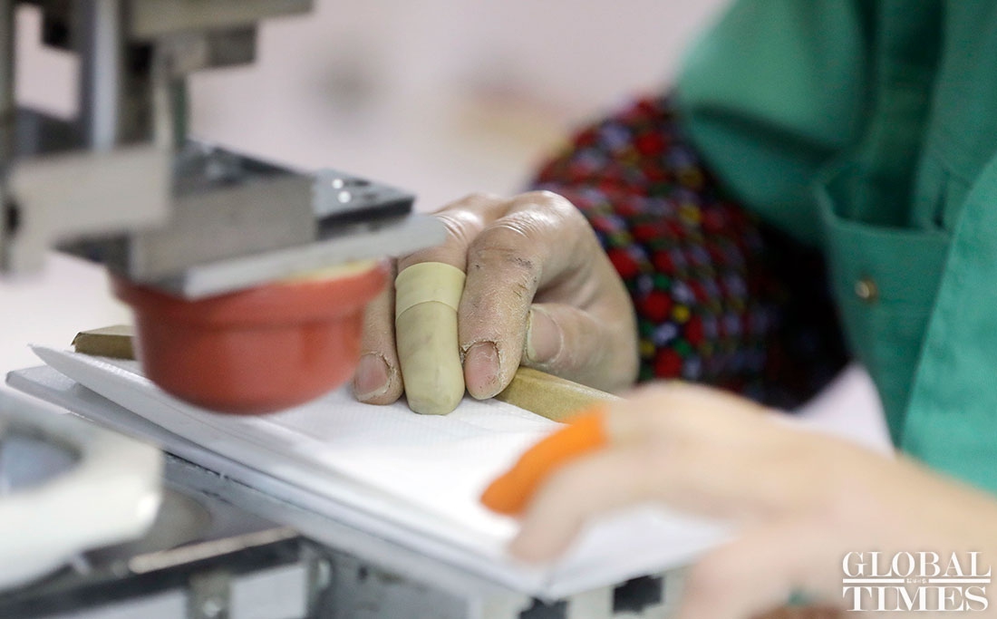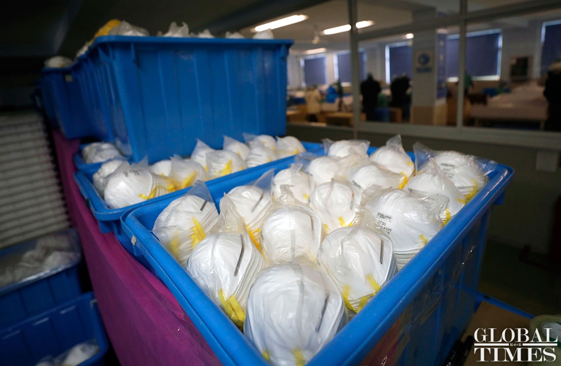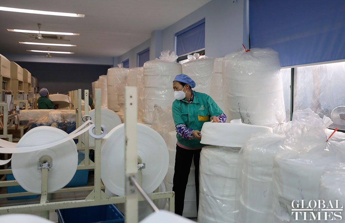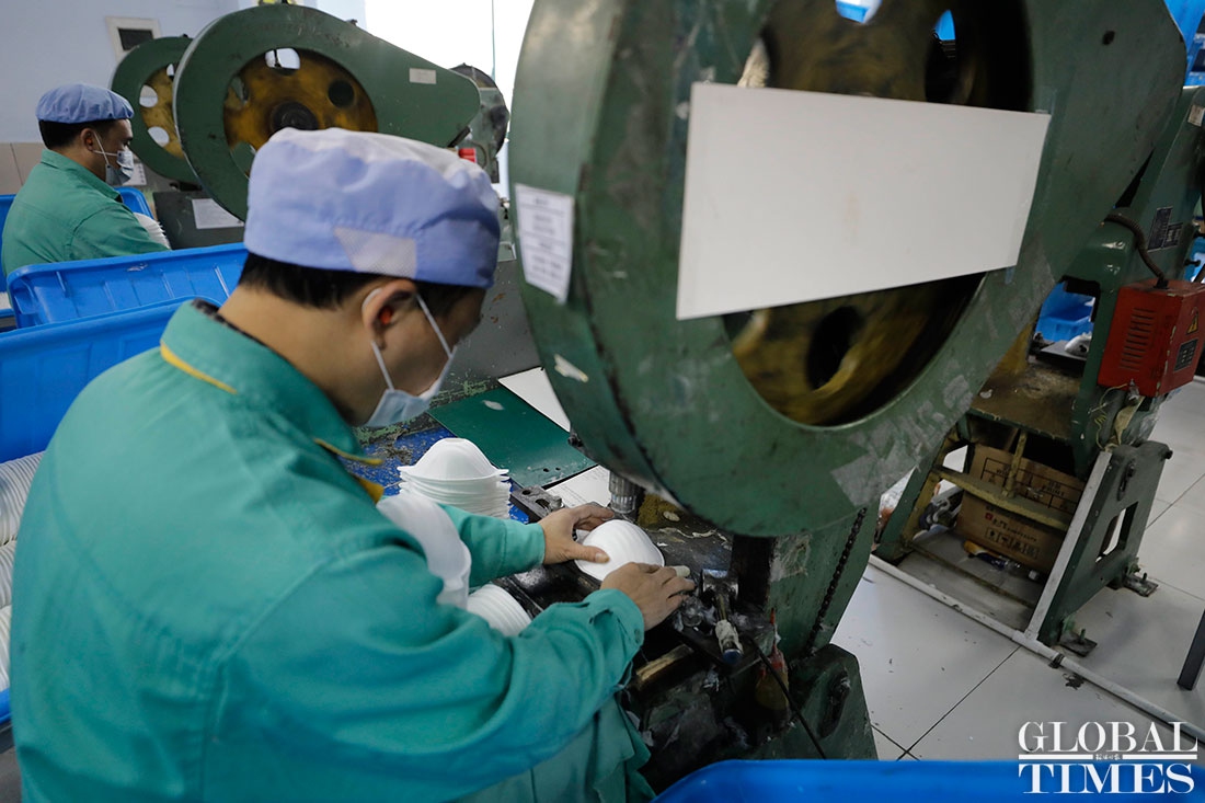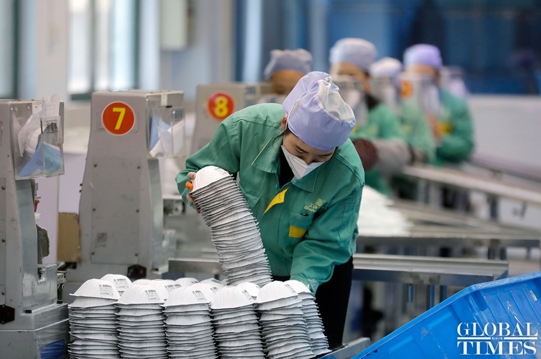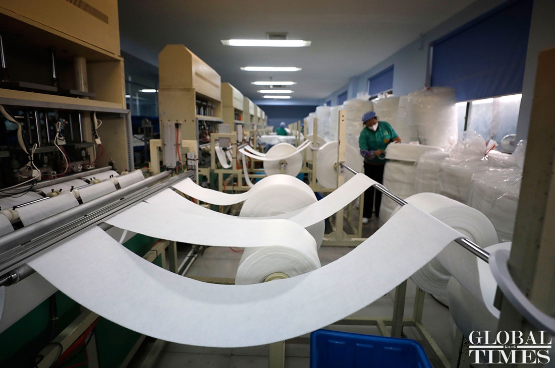 The production line at Shanghai Dasheng Health Products Manufacture Co is running 24 hours a day to produce protective facial masks amid a shortage of medical equipment in China, which is tackling the coronavirus outbreak. The factory can produce about 80,000 masks every day. Photos: Yang Hui/GT