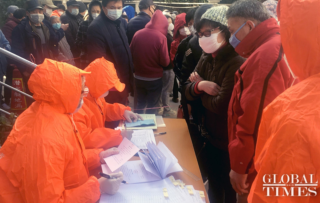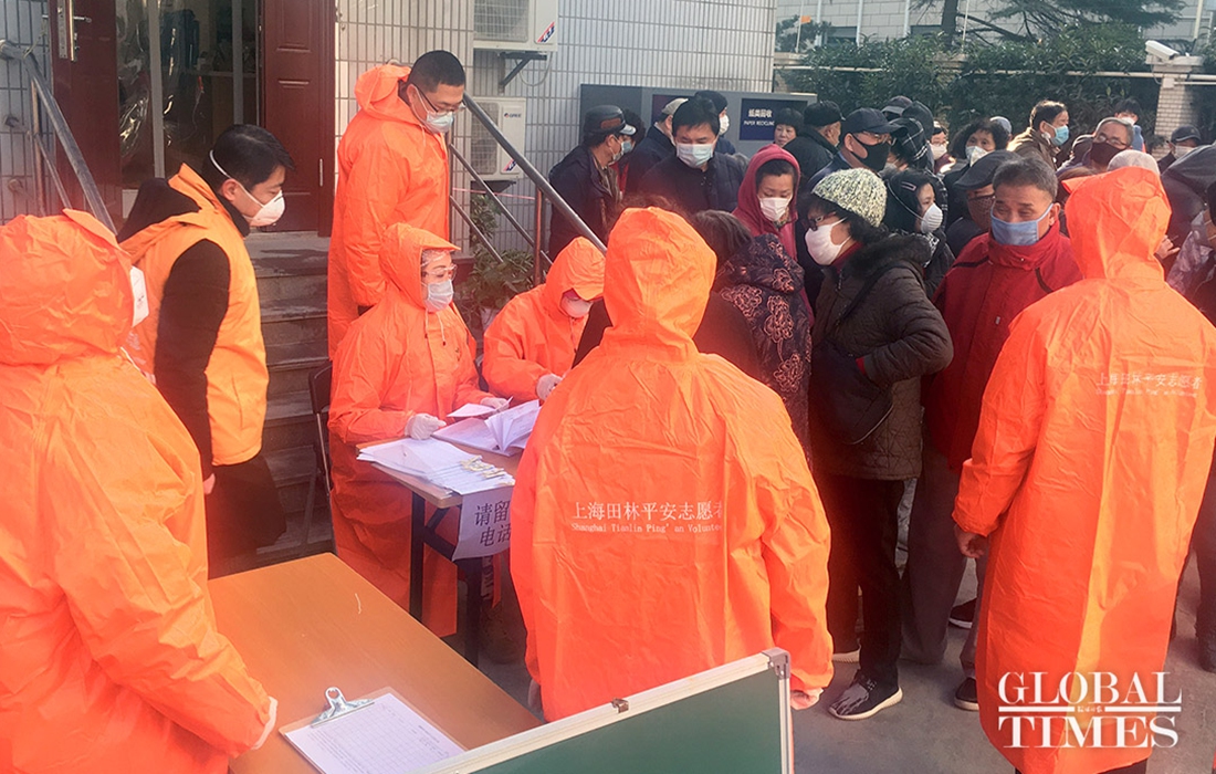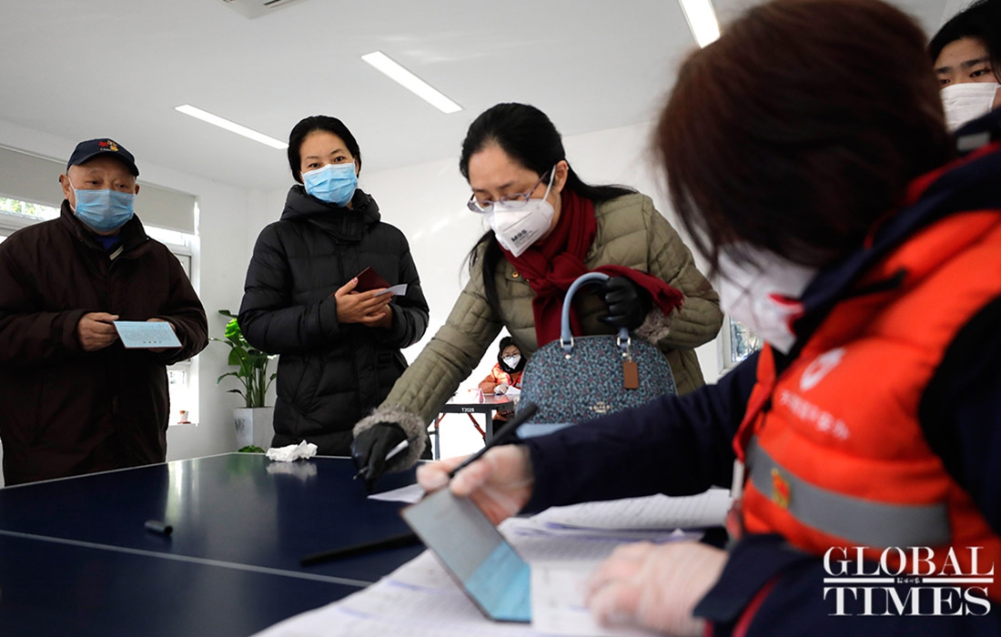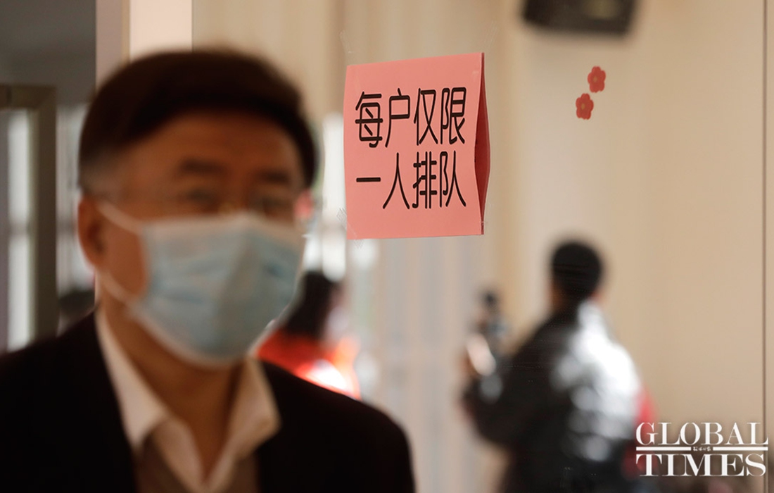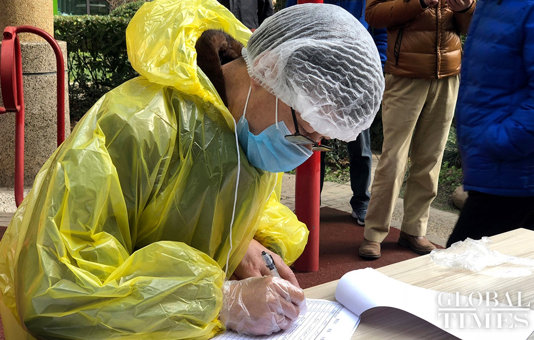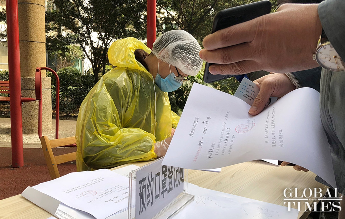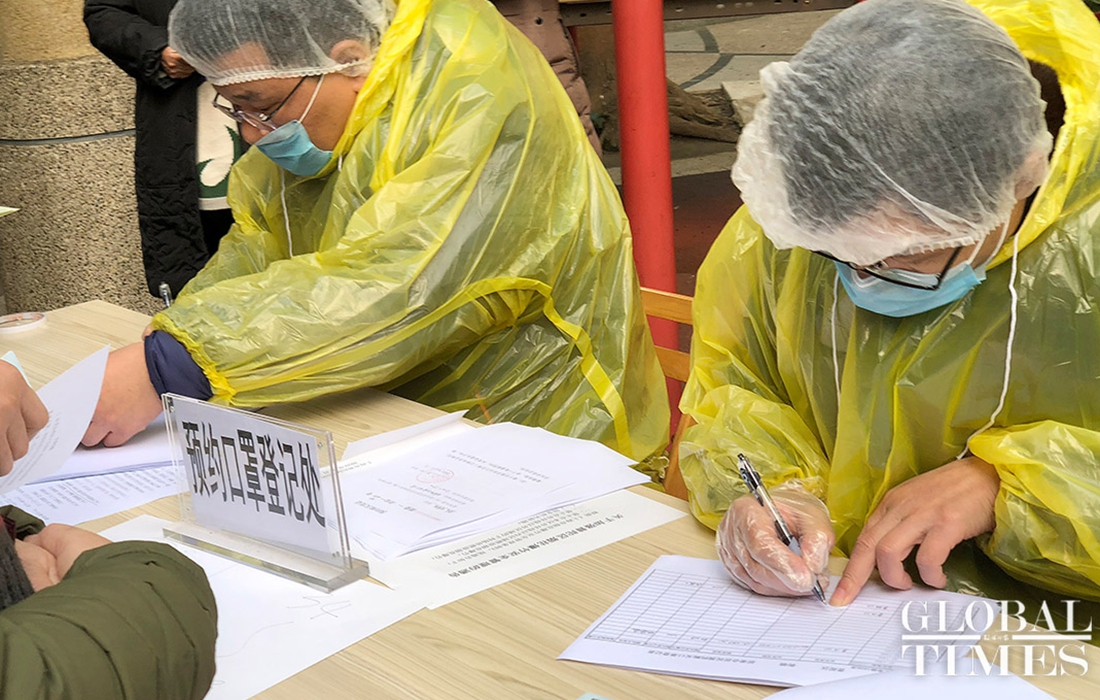 Residents in Shanghai register ID information at their communities on Sunday to get purchase permits which allow them to get quotas of 5 low-priced masks at designated pharmacies.Community officials were seen wearing raincoats and bath-caps to protect themselves while they organized the registration site and maintained order.