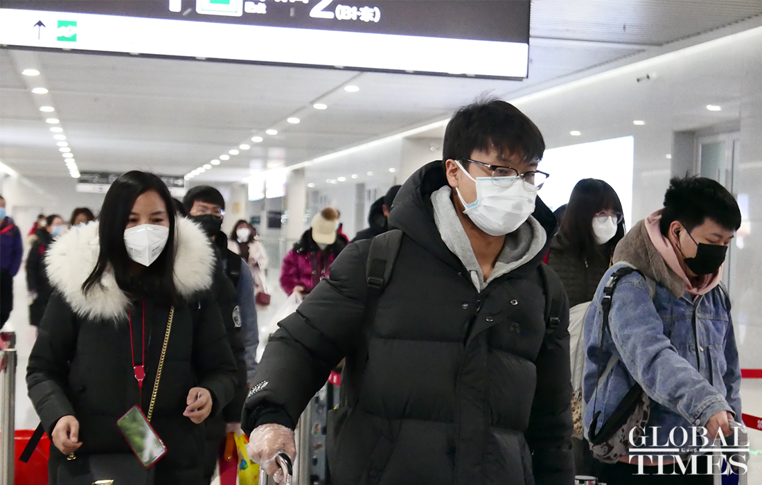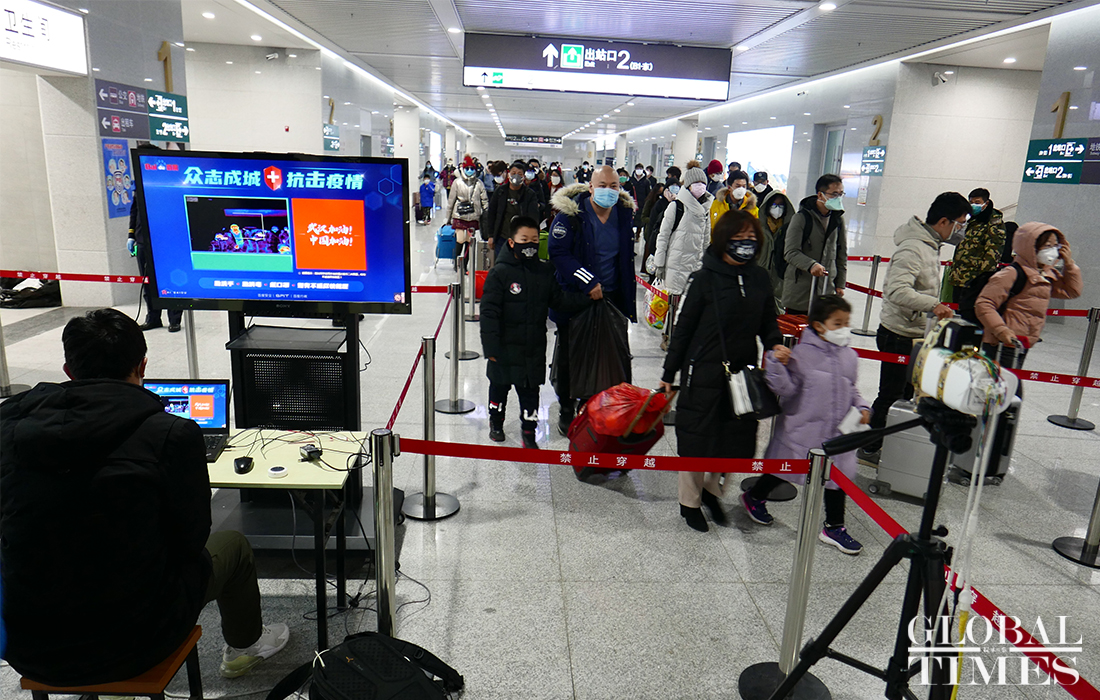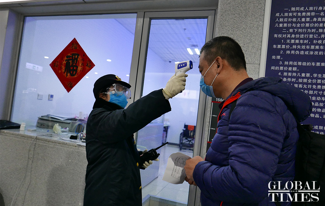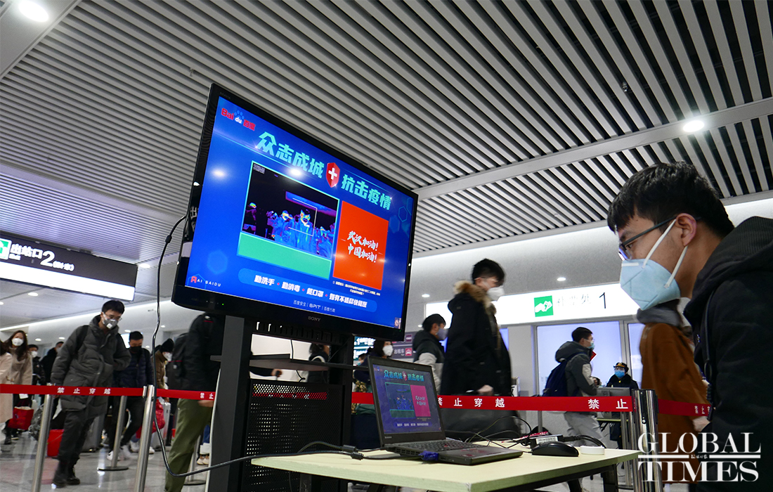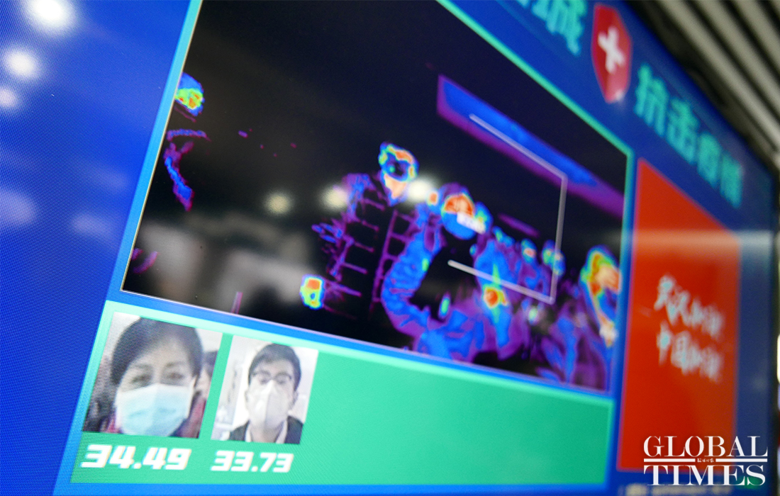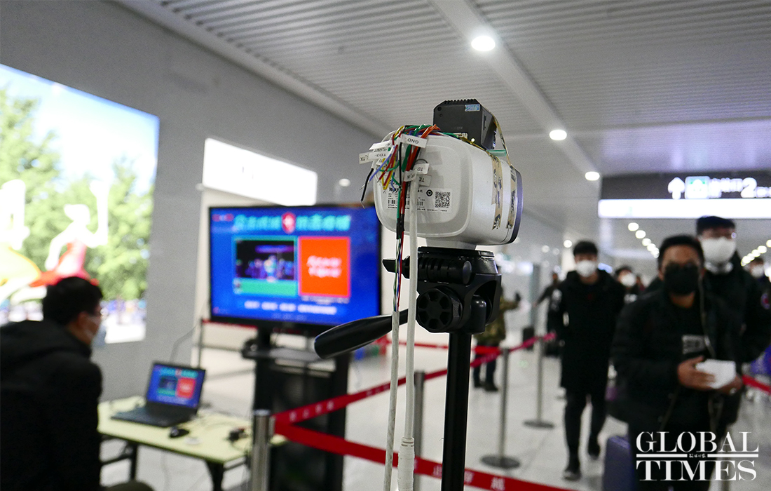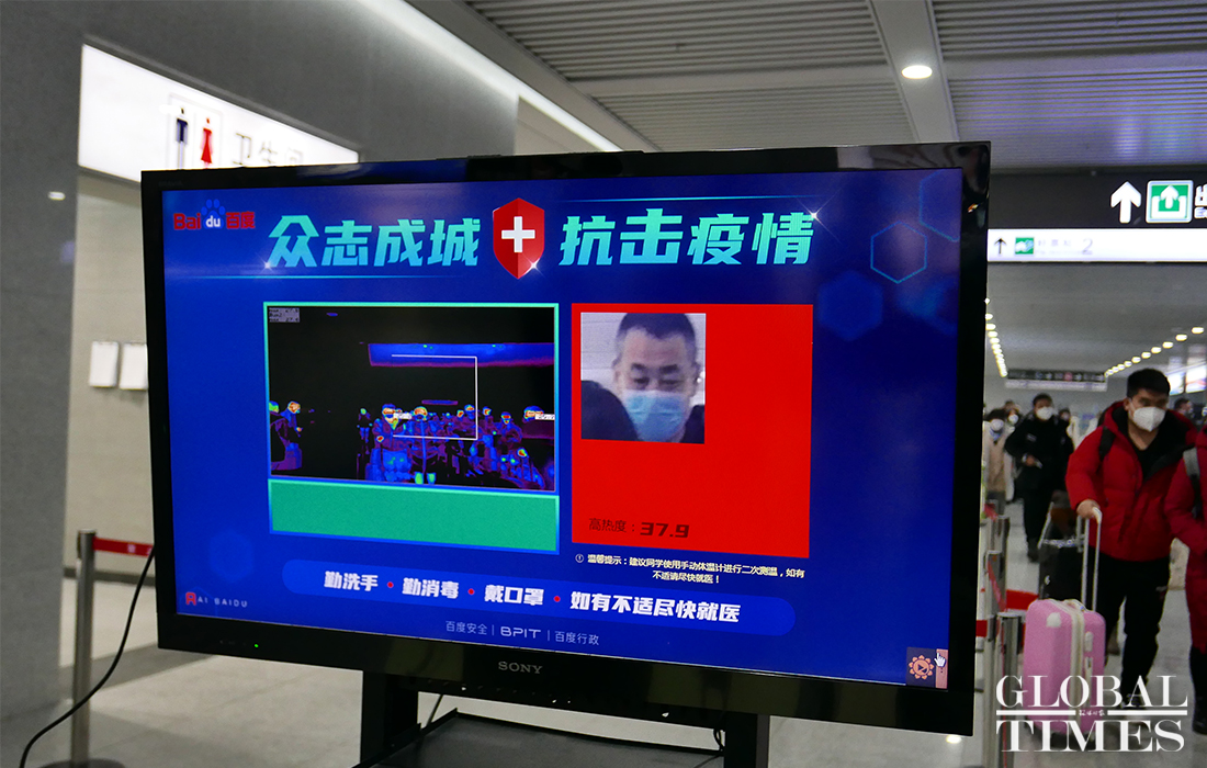 The AI temperature monitoring system was put into use at the Qinghe High-Speed Railway Station in Beijing to measure the temperature of commuters. The station is along the Beijing-Zhangjiakou high-speed railway. When passengers exit the station, this system can scan their faces and detect the body temperature. Passengers whose temperature is found higher than the set value will be taken aside for manual retesting. This device can monitor 50 people on the screen at a time and results are unaffected even if someone is wearing a mask. Photos: Li Hao/GT