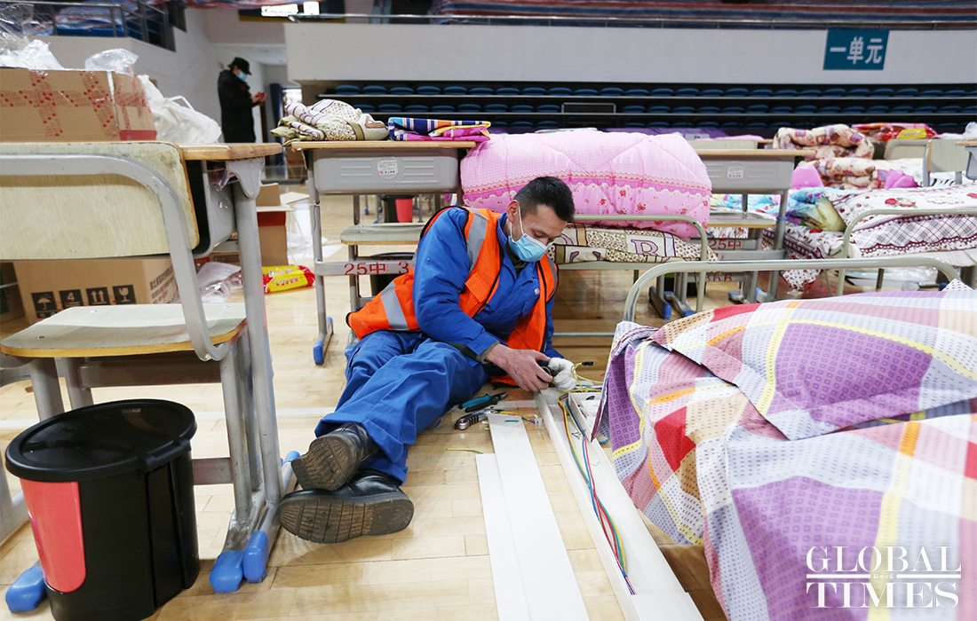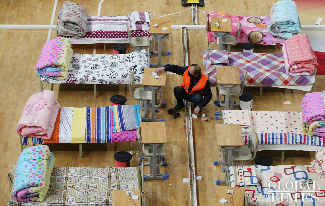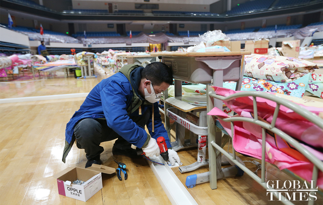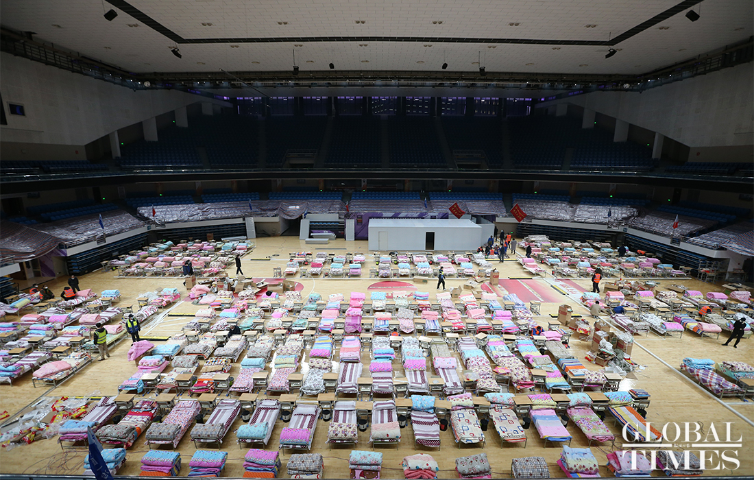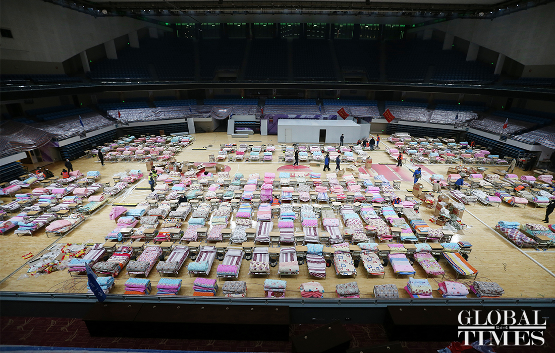 Construction on a "Fang Cang" makeshift hospital in Wuhan’s Hongshan Gymnasium with 800 beds, entered the final stage on Tuesday evening. Three "Fang Cang" makeshift hospitals in the Hongshan Gymnasium, Wuhan International Conference and Exhibition Center, and a cultural building complex dubbed "Wuhan Livingroom" began construction Monday evening to treat patients with mild novel coronavirus (2019-nCoV) infection.