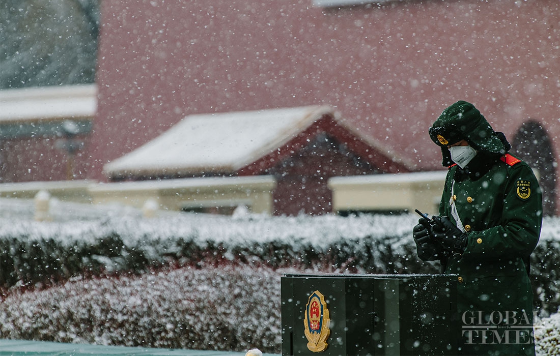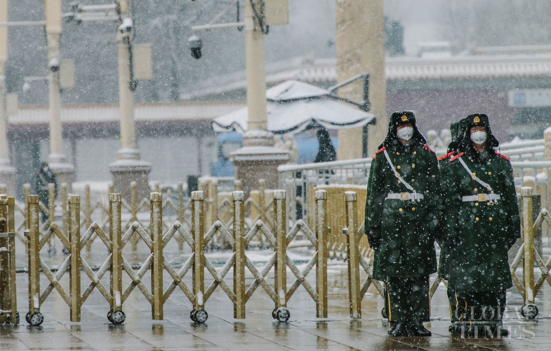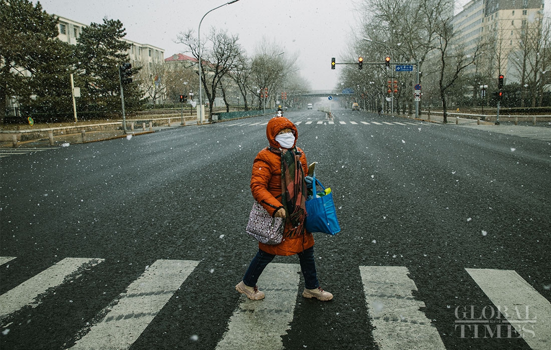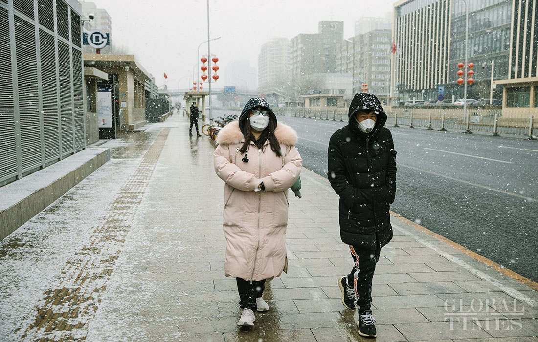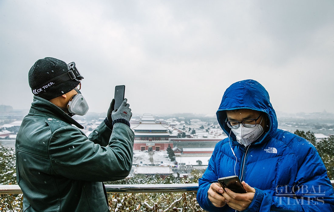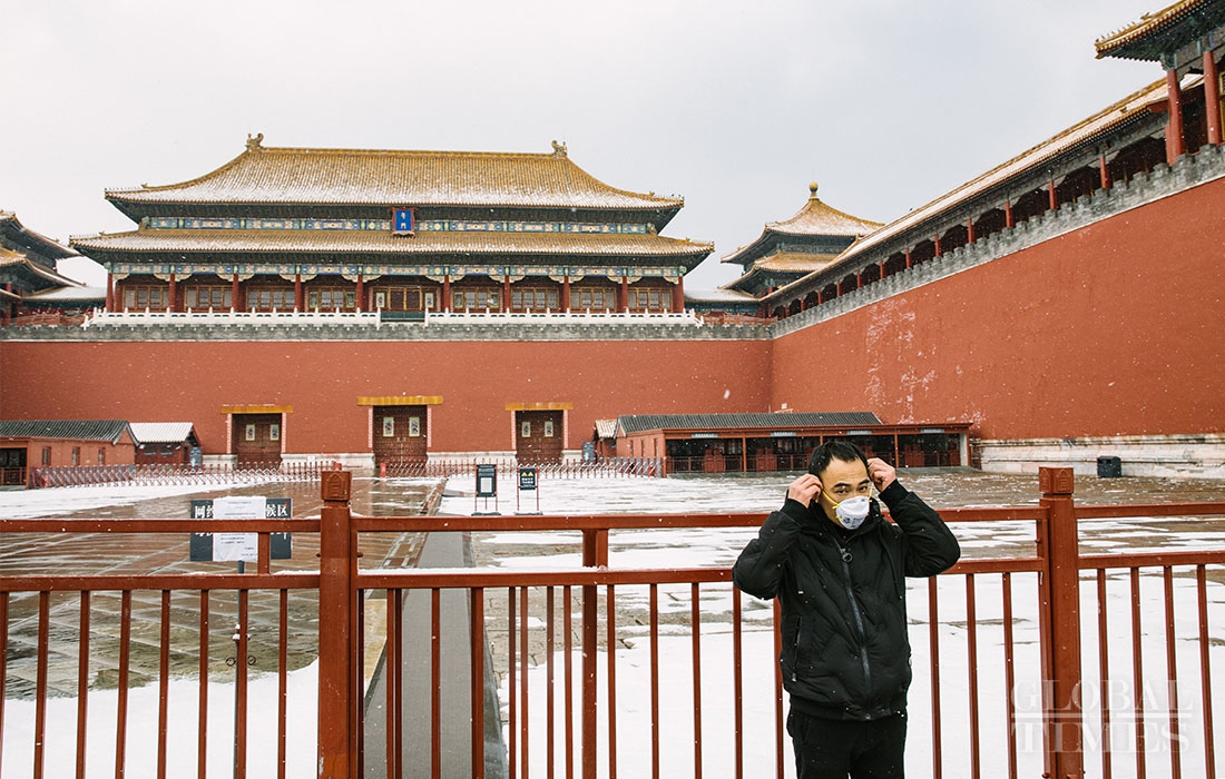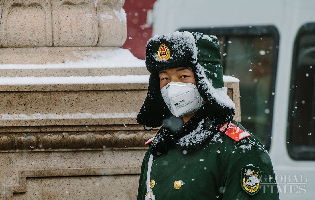 Some people wearing masks are seen at scenic spots in Beijing such as Tiananmen Square as the city received a sudden snowfall on Feb 5, 2020. People have been advised to stay indoors to avoid contracting the coronavirus. Photos: Li Hao/GT