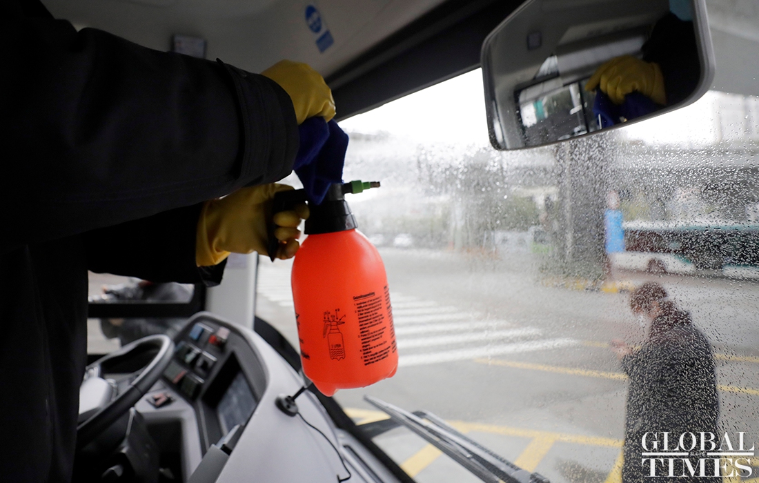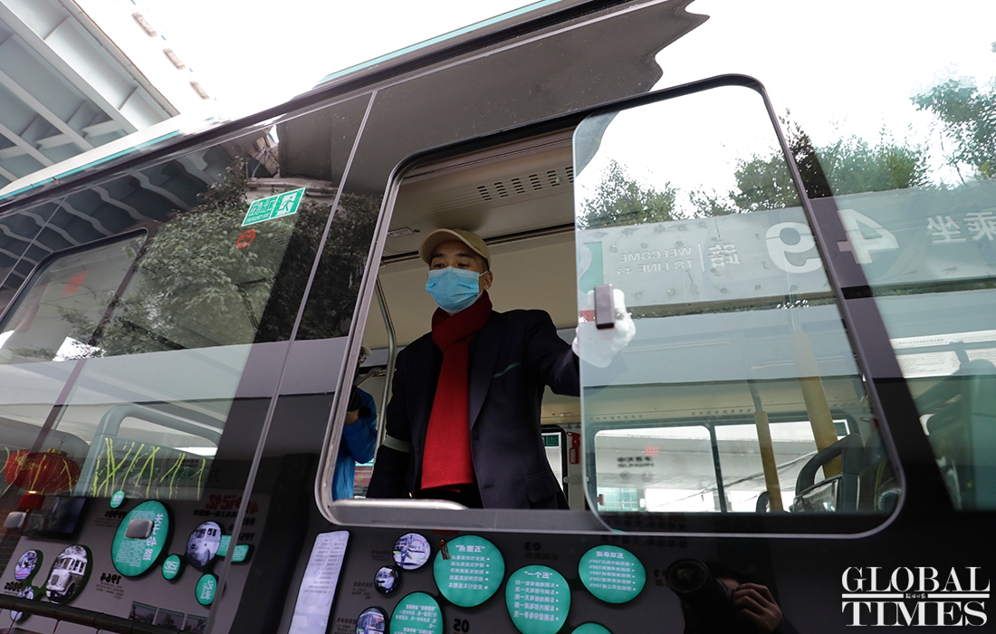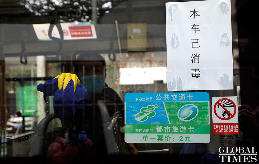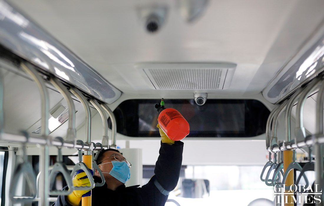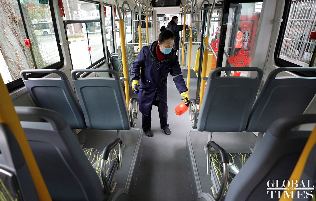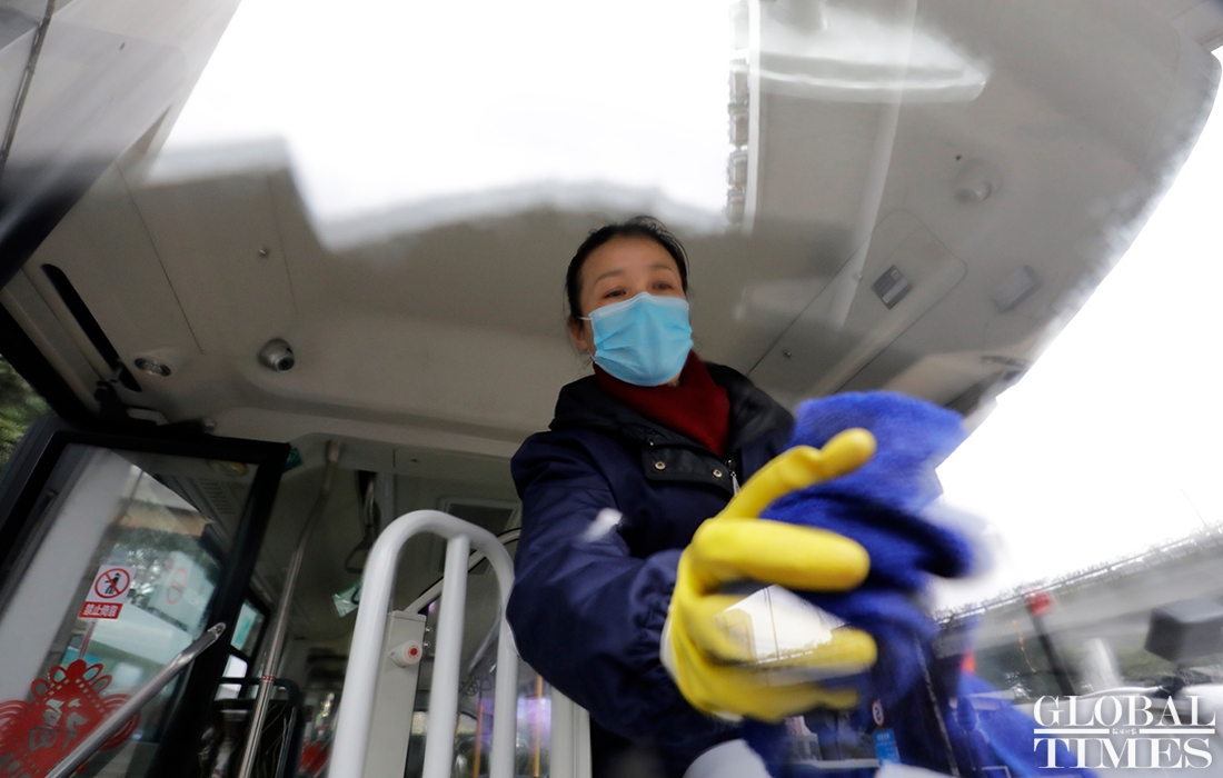 Photos taken on Feb 6 show staff disinfecting Route 49 buses in Shanghai in preparation for commuters to resume work next Monday. 15 out of 19 stops on Route 49 pass by hospitals, so staff have to disinfect the buses three times a day. Photos: Yang Hui/GT