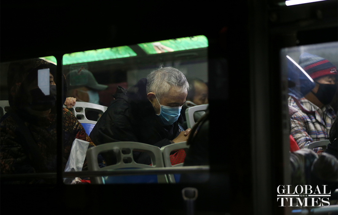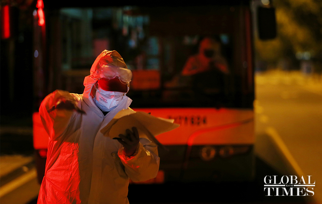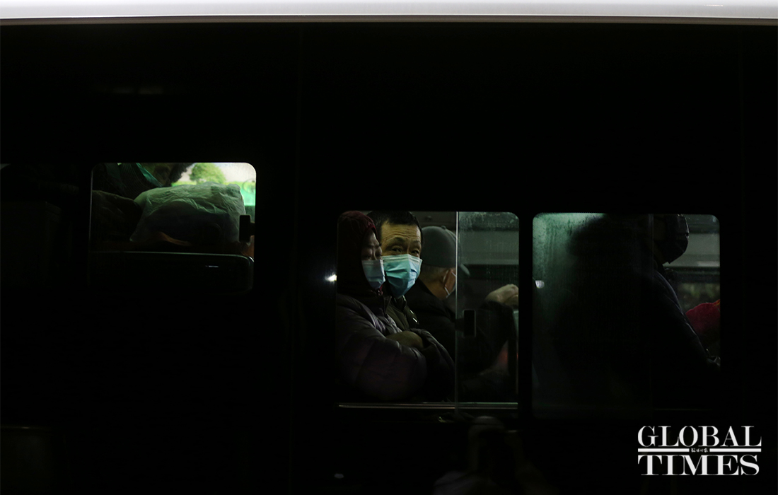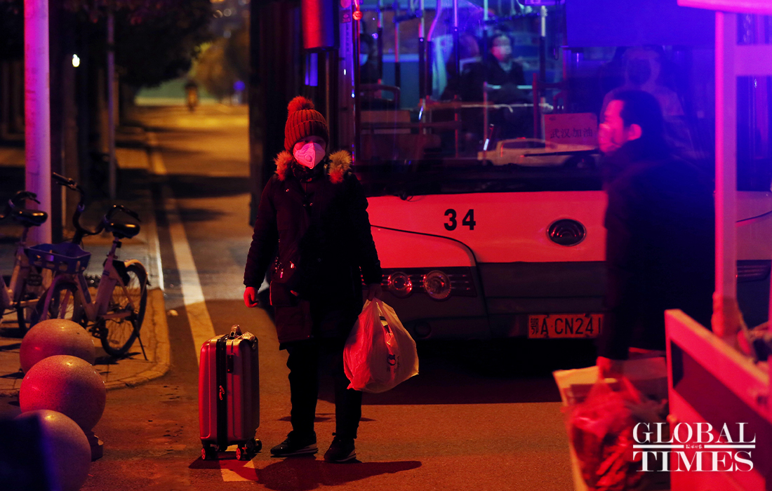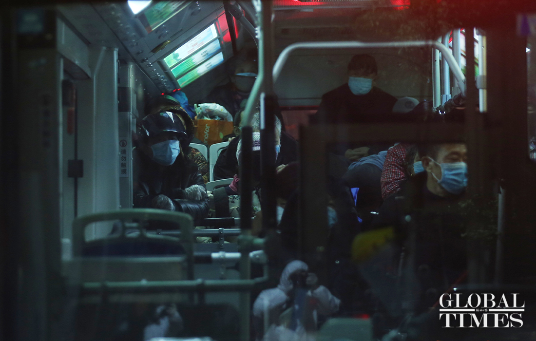 Patients infected with the novel coronavirus pneumonia (NCP) in Wuhan’s Wuchang district were transferred to Hongshan Gymnasium, which has been converted into a makeshift hospital, and Tongji Hospital respectively depending on their symptoms for further treatment Sunday night. Wuhan officials implemented the “bring everyone together who needs treatment” policy, a move that gives priority to four types of patients so they can receive immediate treatment. Attention will be given to all confirmed and suspected cases, along with those who have a fever and anyone else that was in close contact with them on the same day. Photos: Cui Meng/GT