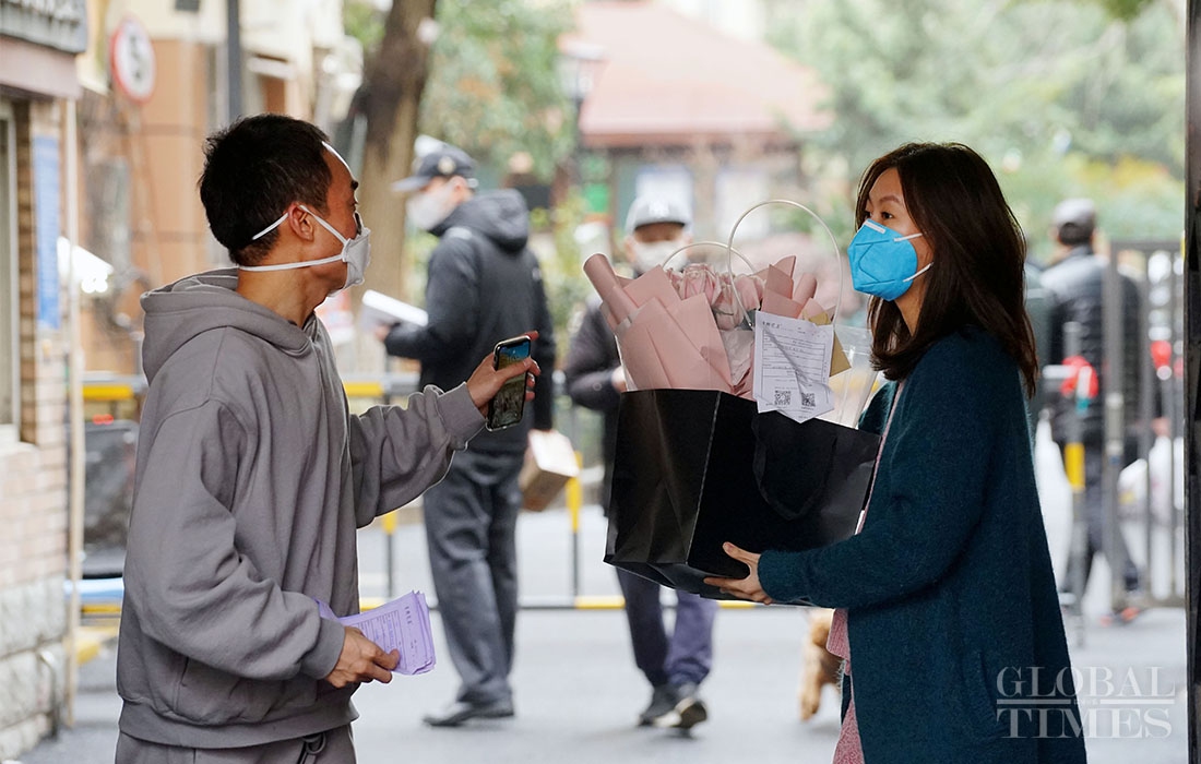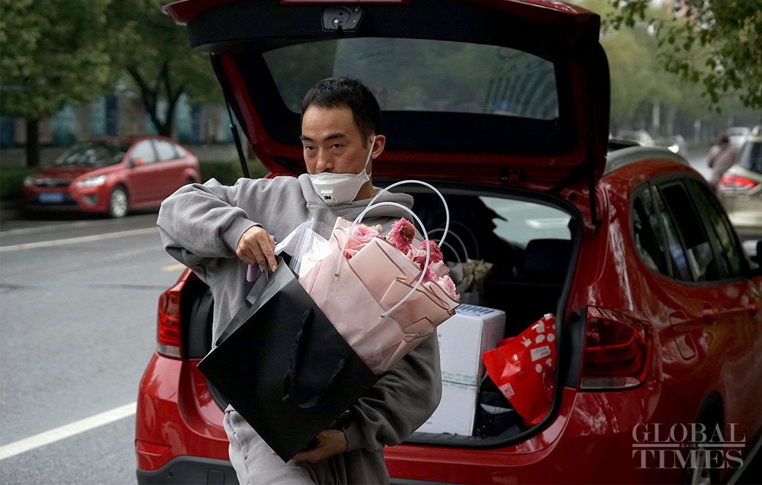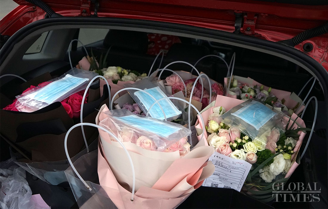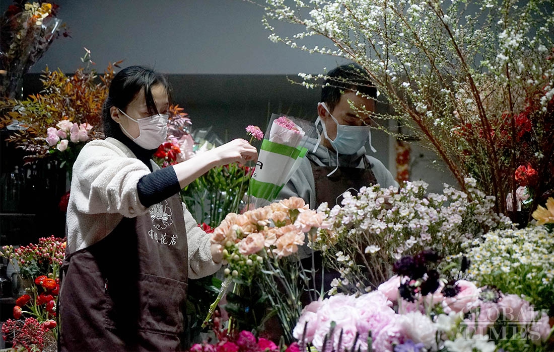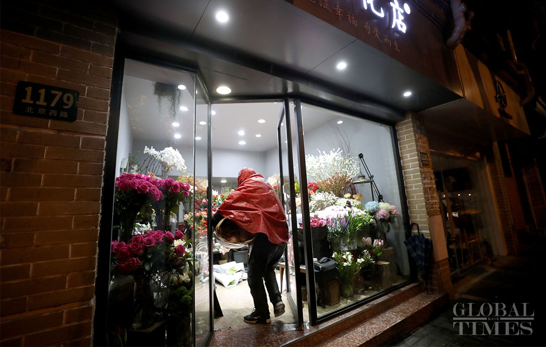 A florist on Beijing West Road in downtown Shanghai said orders have plunged 90 percent this year because of the COVID-19 outbreak. With three employees in quarantine, shop owners Li Youkang and his wife have personally delivered flowers to customers themselves during St. Valentine's Day on Friday. But they told the Global Times they still believe in a rosier future for their beautiful industry. Photos: Yang Hui/GT