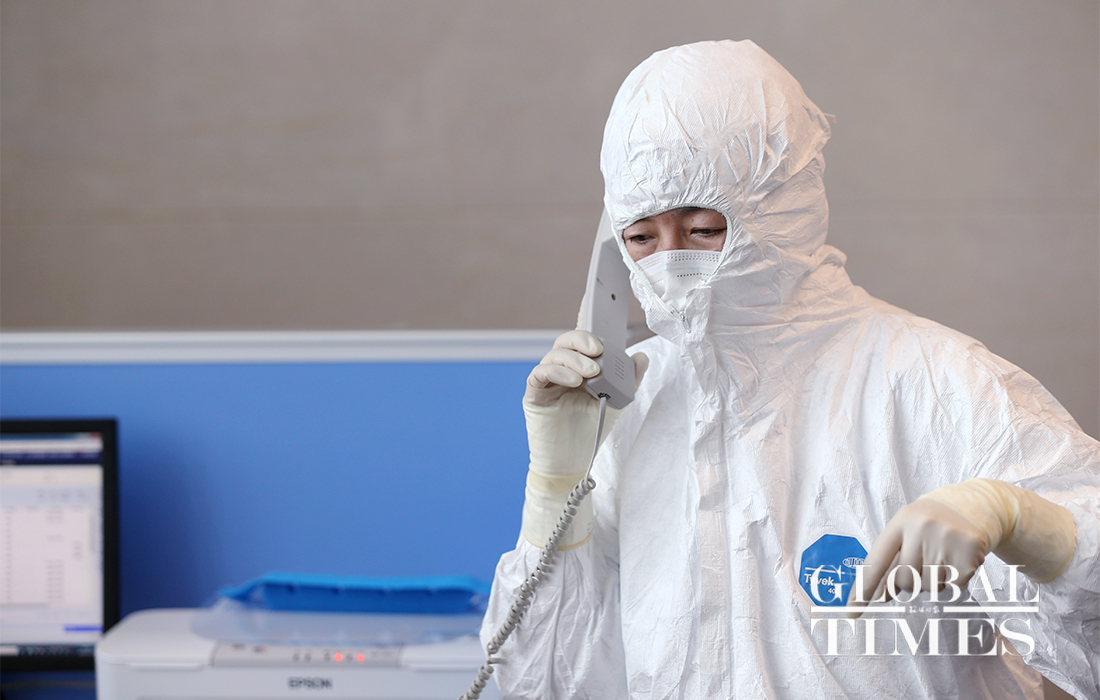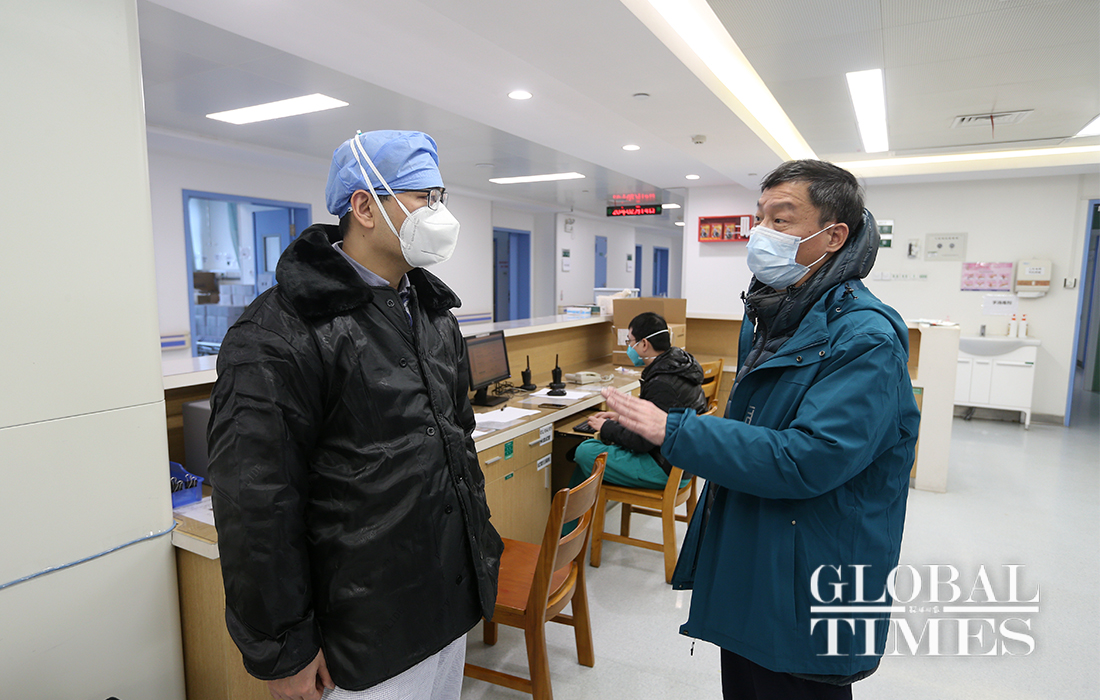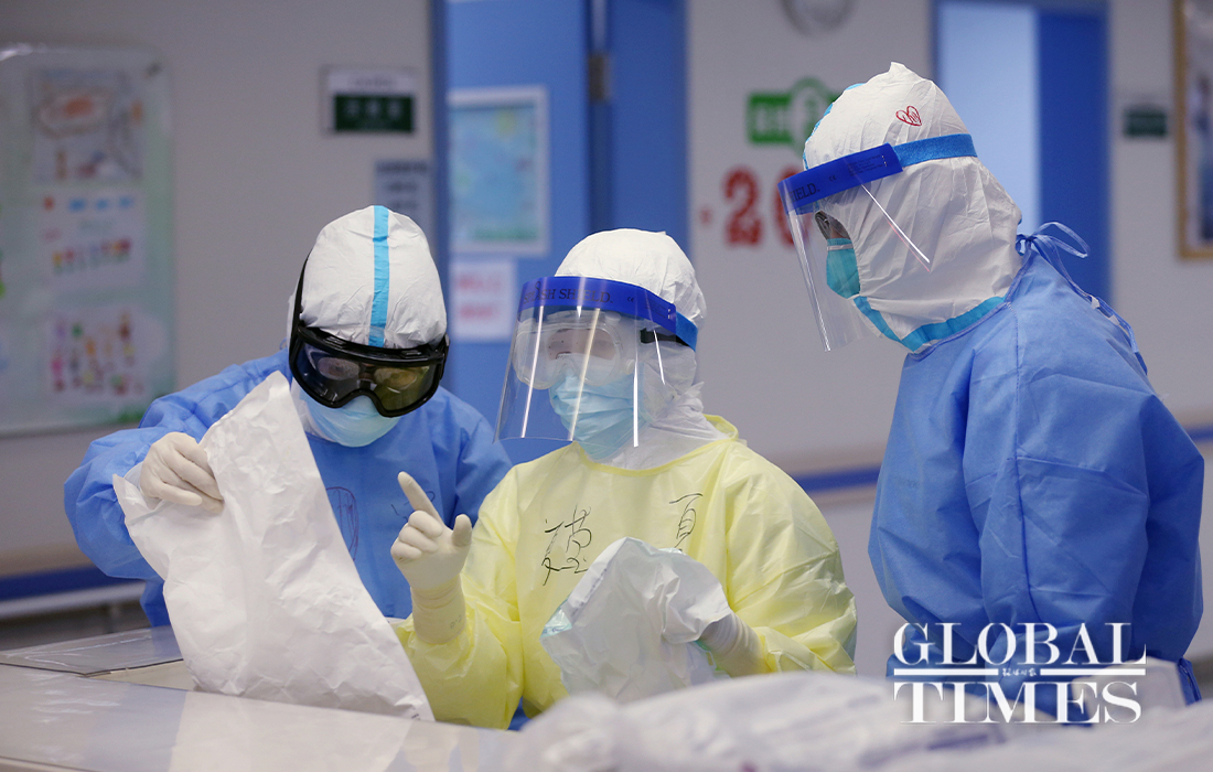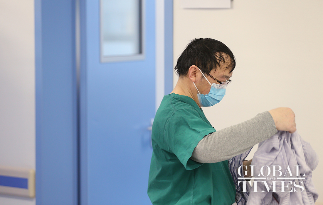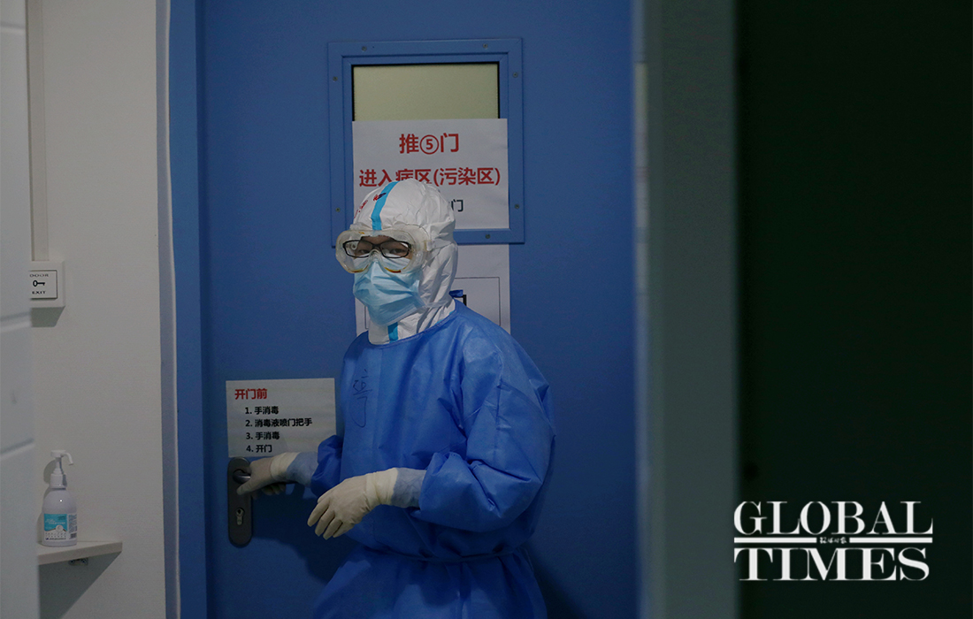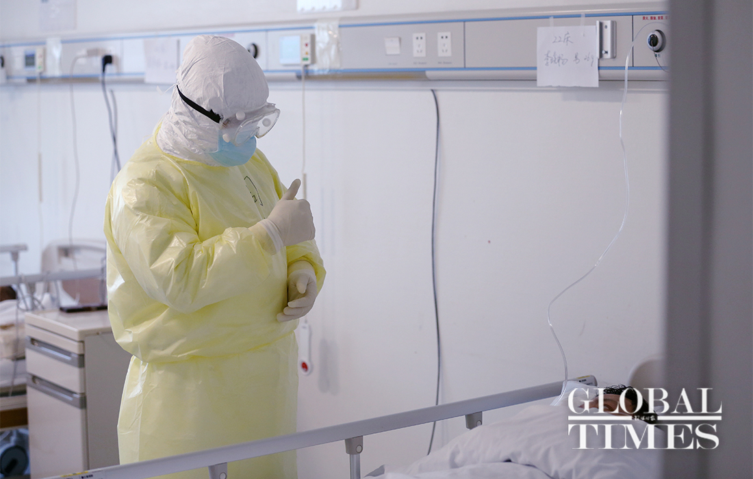 Liu Zhengyin, the head of the first national medical team to arrive in Wuhan, from Peking Union Medical College Hospital, prepares to enter the ICU at the Zhongfa Xincheng branch of Wuhan Tongji Hospital on February 14, 2020. Photo: Cui Meng/GT figcaption >