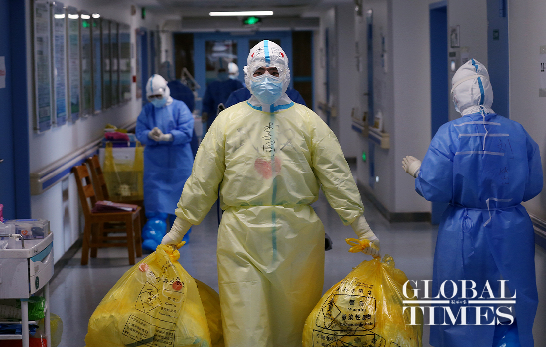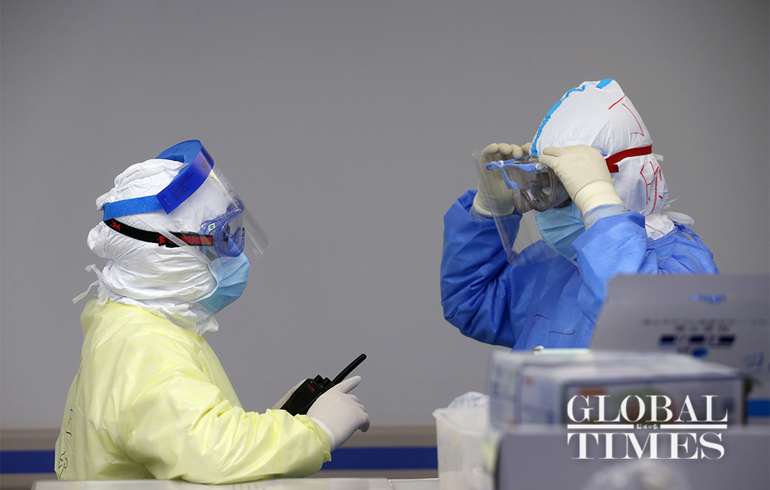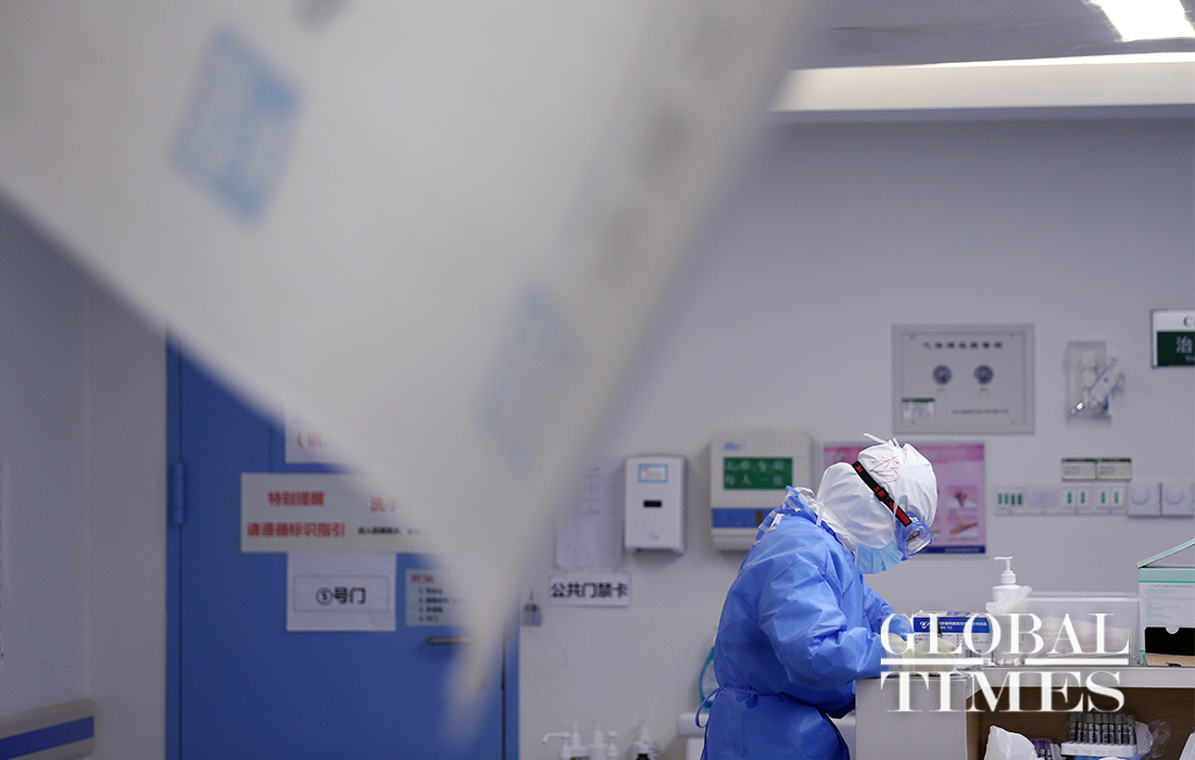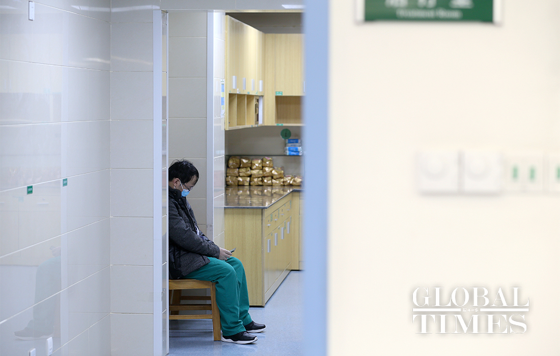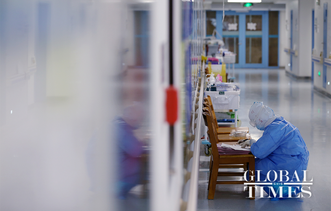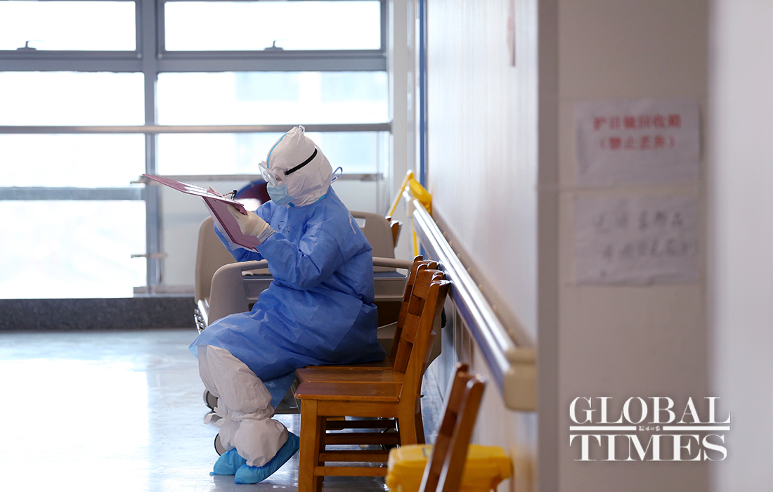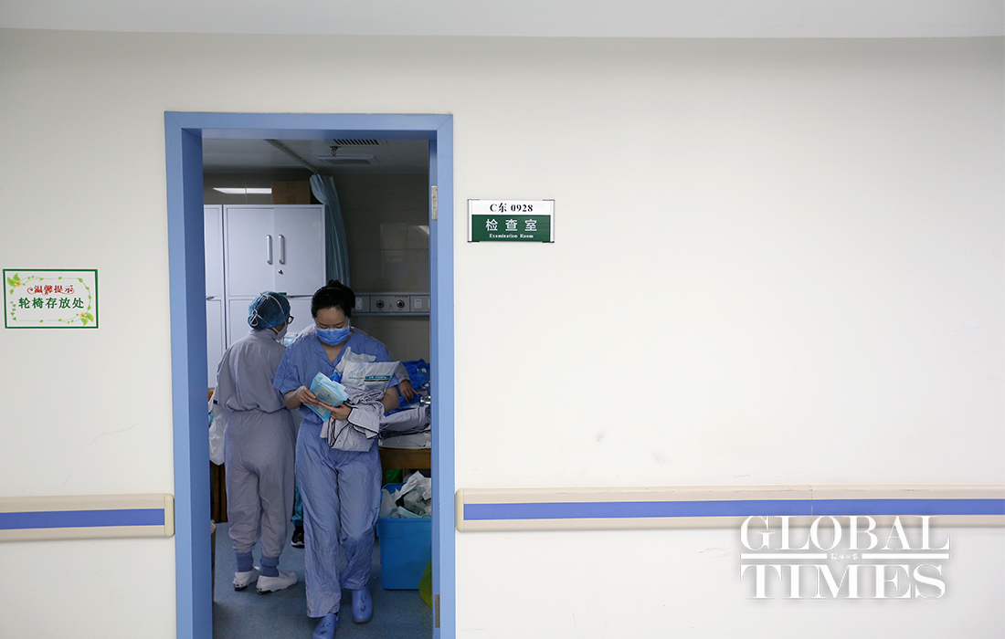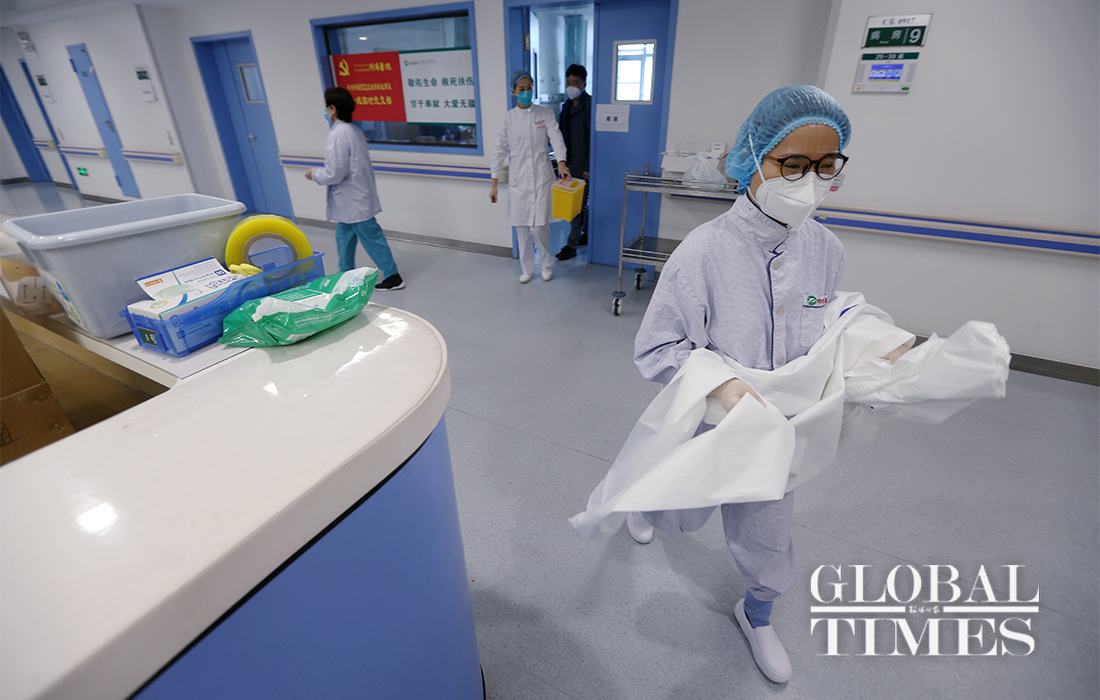 A nurse exits the ICU ward to her way to the clean area after undergoing rigorous disinfection and protective clothing removal procedures inside the Zhongfa Xincheng branch at Wuhan Tongji Hospital on February 14, 2020. Photo: Cui Meng/GT figcaption >