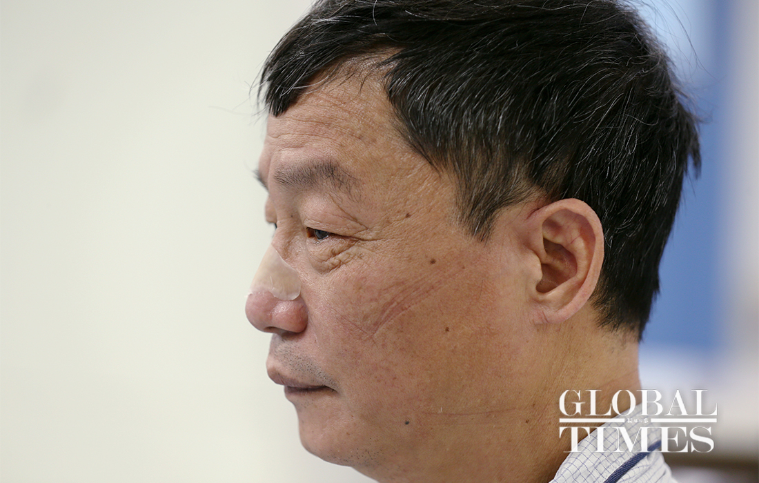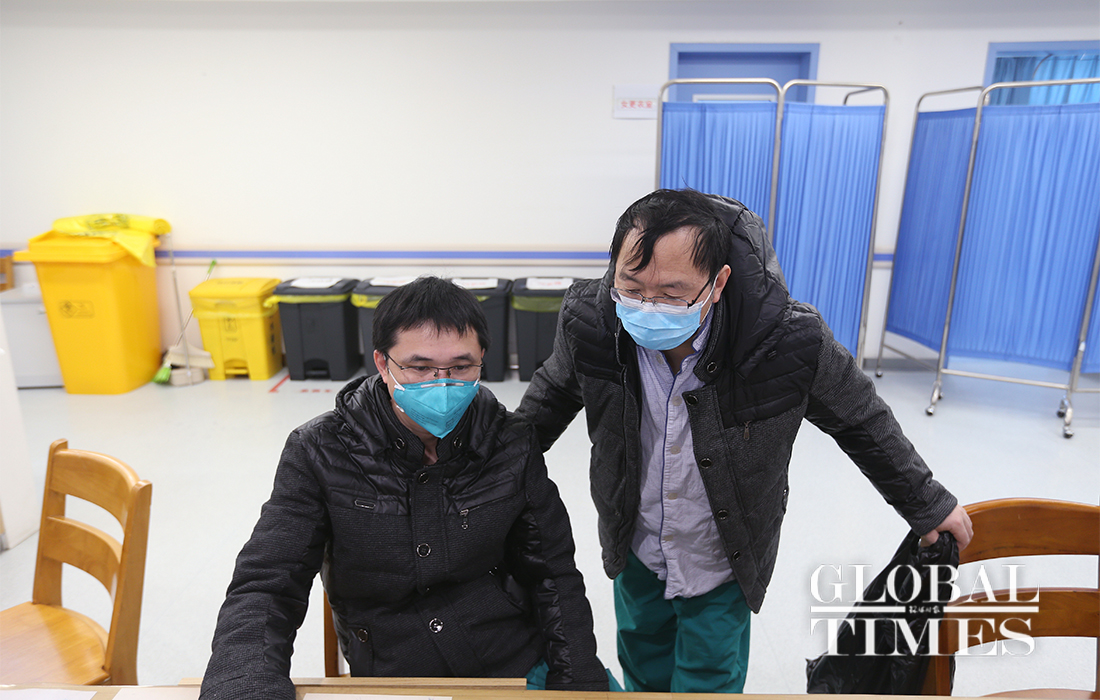 Zhou Xiang, deputy head of the first national medical team from Peking Union Medical College Hospital, expresses gratitude to one of his patients, Li Xiao, for his persistence and cooperation, as doctors saved his life at the Zhongfa Xincheng branch of the Wuhan Tongji Hospital on February 14, 2020. Photo: Cui Meng/GT figcaption >