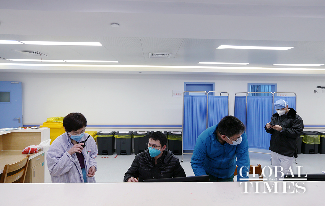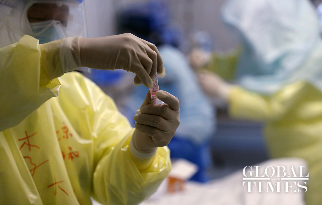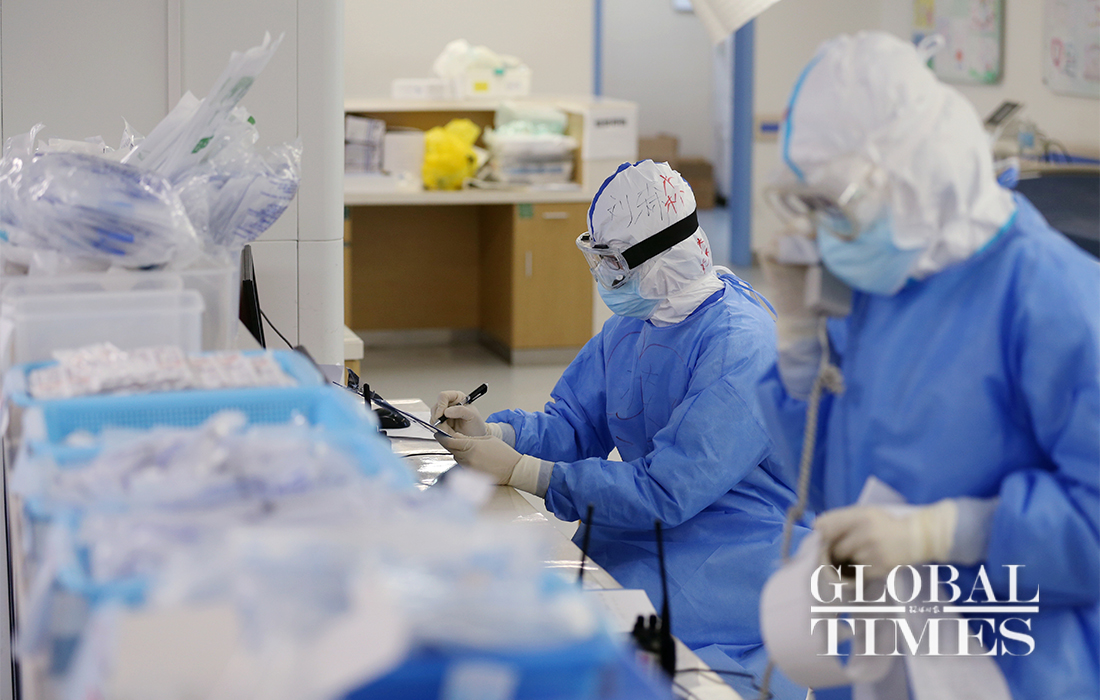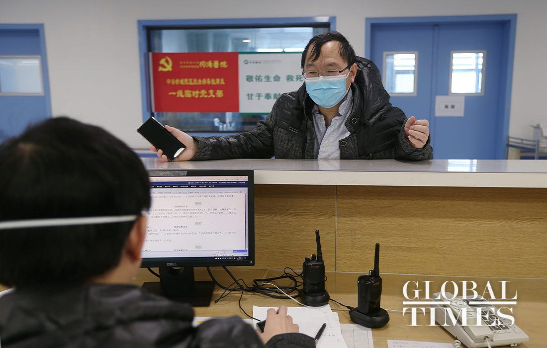 Li Taisheng, director of infectious medicine at Peking Union Medical College Hospital marks a patient's nasopharyngeal swab at the Zhongfa Xincheng branch with Wuhan Tongji Hospital on February 14, 2020. Photo: Cui Meng/GT figcaption >