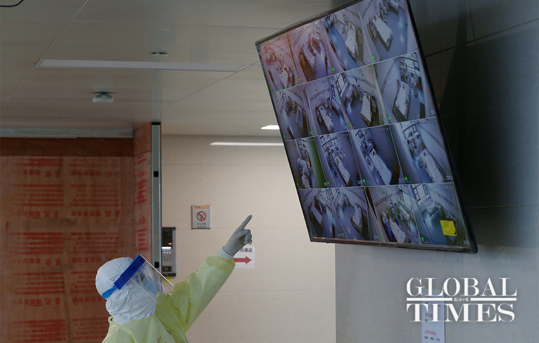 A nurse monitors a patient’s condition in the ICU ward at the Zhongfa Xincheng branch of the Wuhan Tongji Hospital on February 14, 2020. Photo: Cui Meng/GT figcaption >