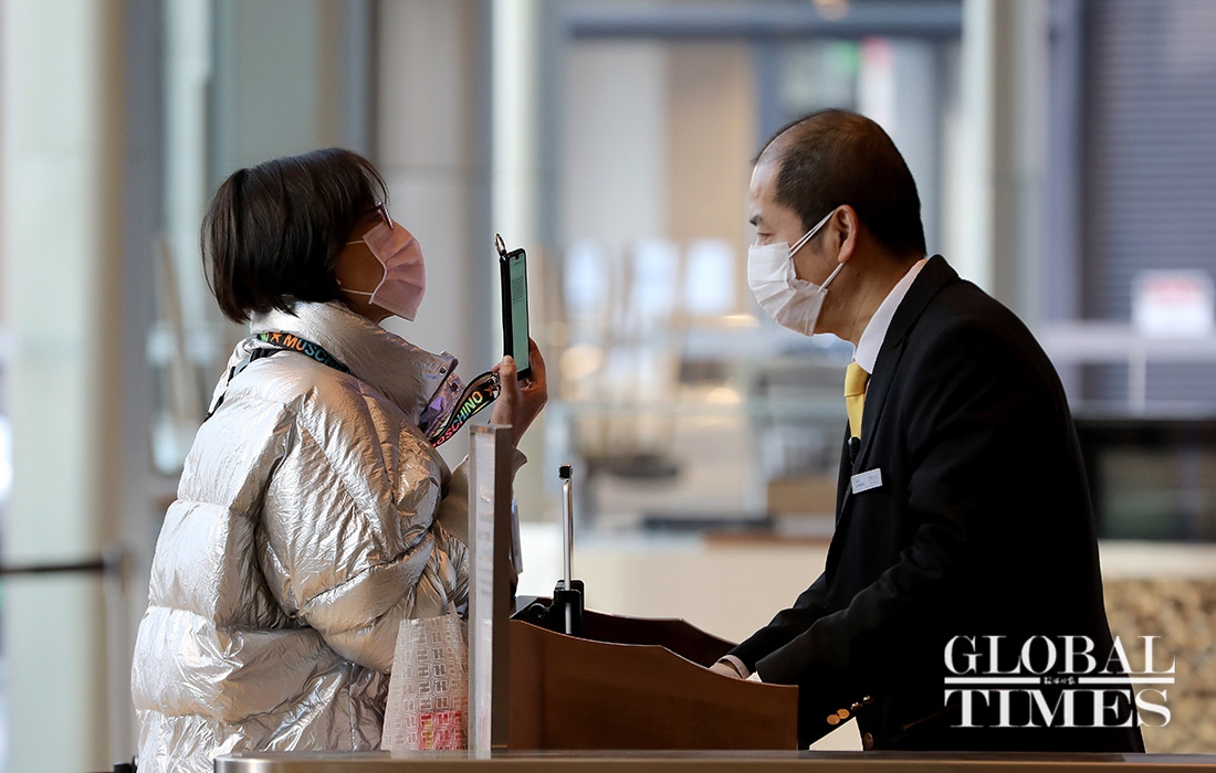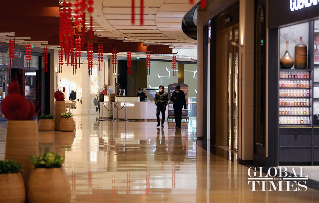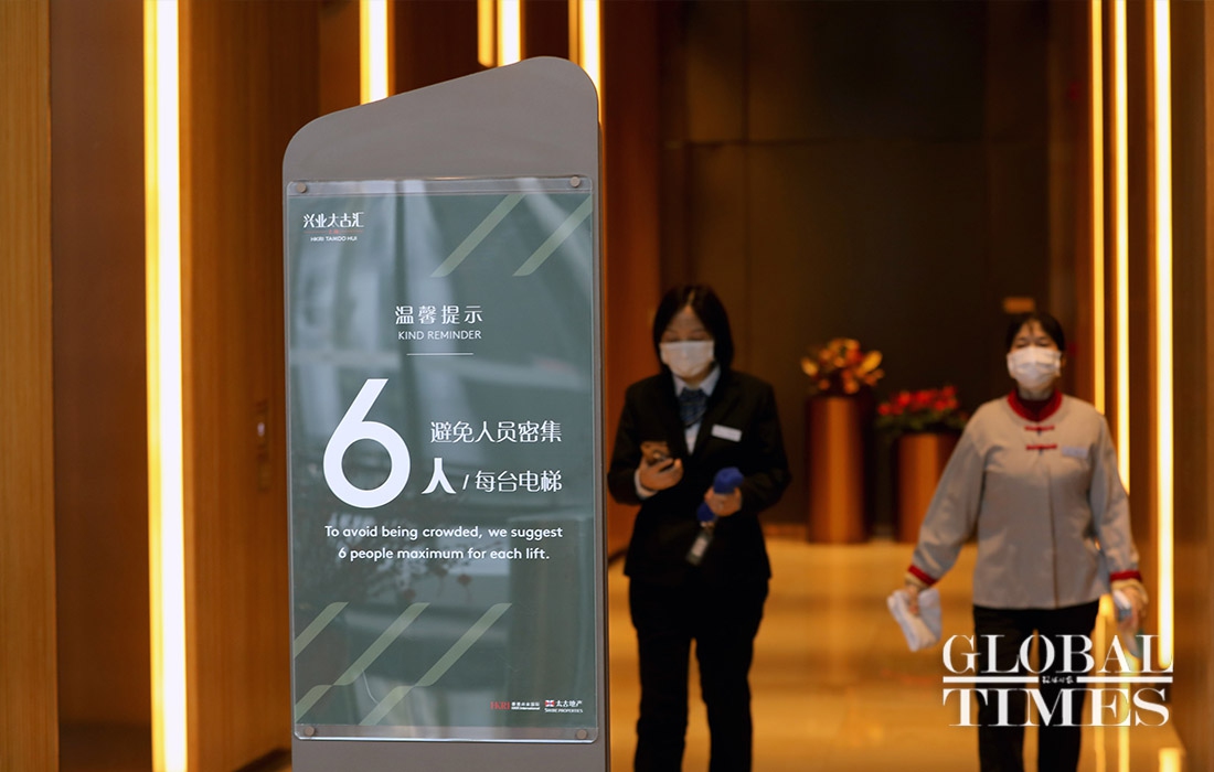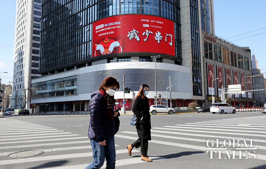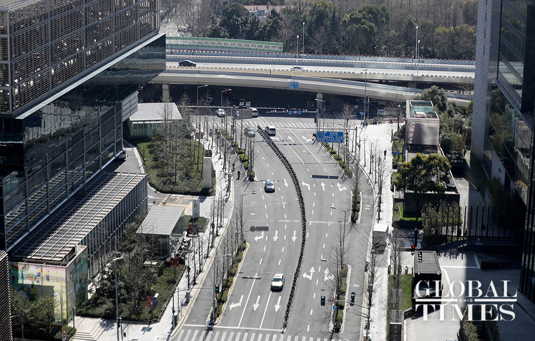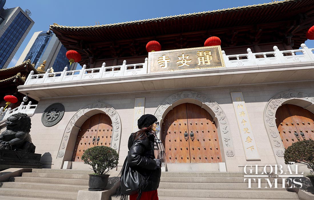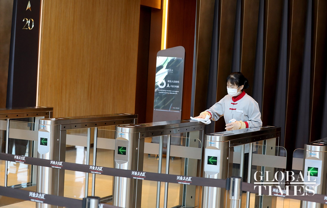 Some shops along the Nanjing West Road in Shanghai resumed their business on Monday, while parks and other public spaces like Jing'an Temple remain closed. The city wears a blanket of silence, barring a few people and vehicles, the usual city bustle is absent from the streets. Employees are mandated to get their temperature screened and present the notice of "approval of work resumption," before entering the office premises. Only six persons are allowed at a time inside office elevators.(Photos: Yang Hui/GT)