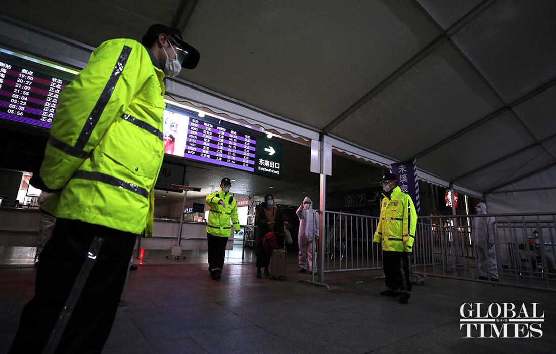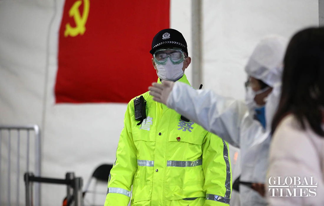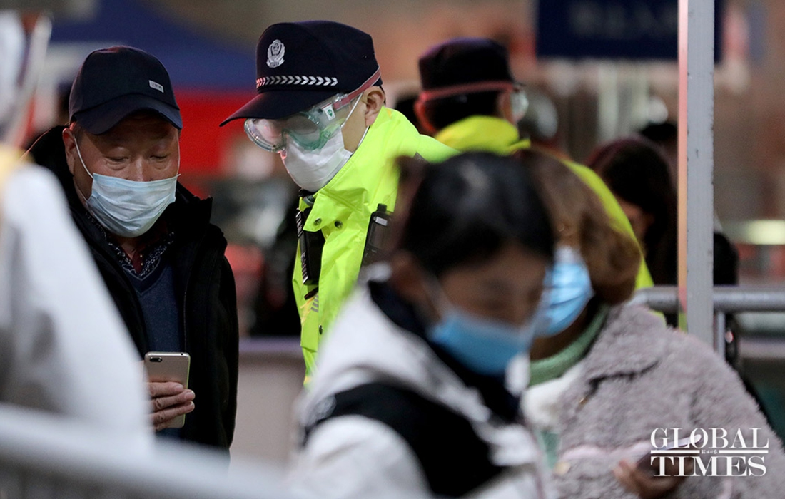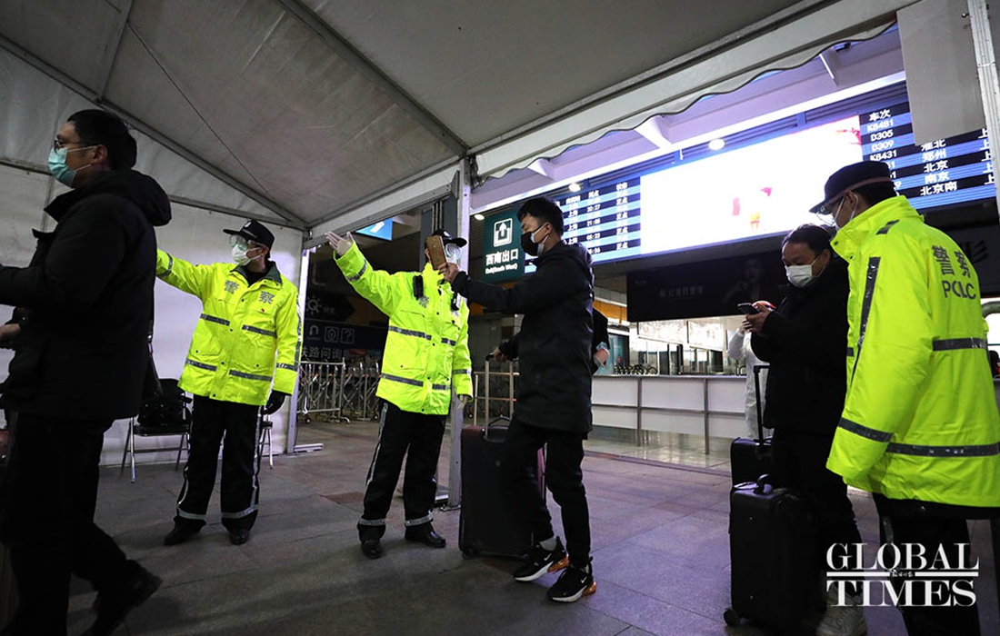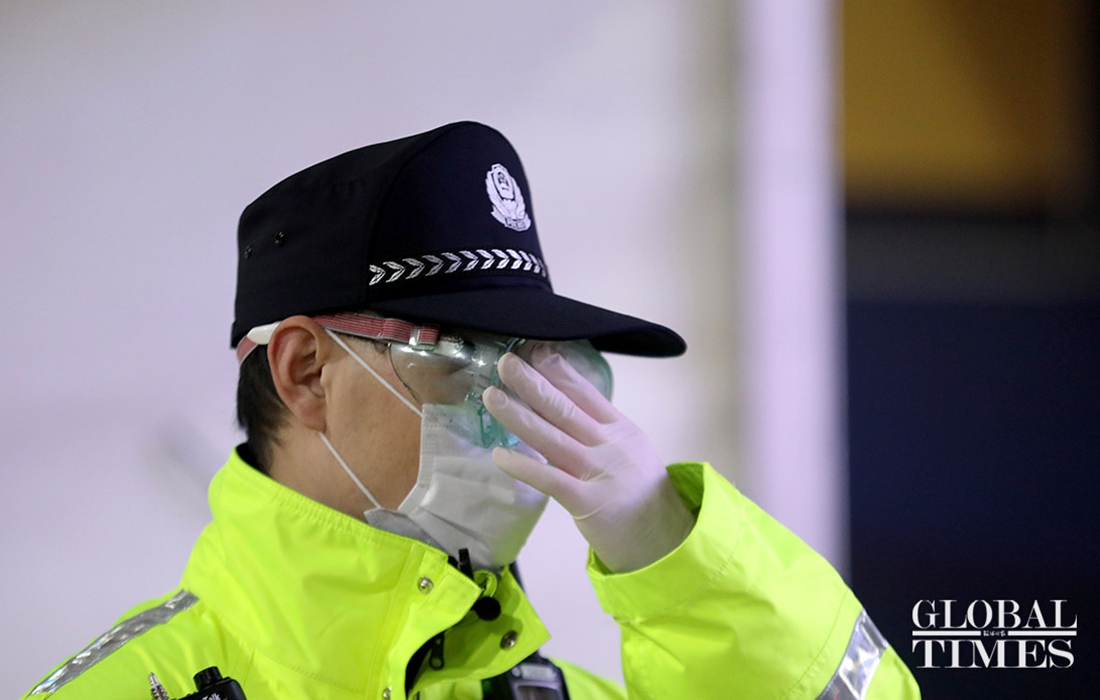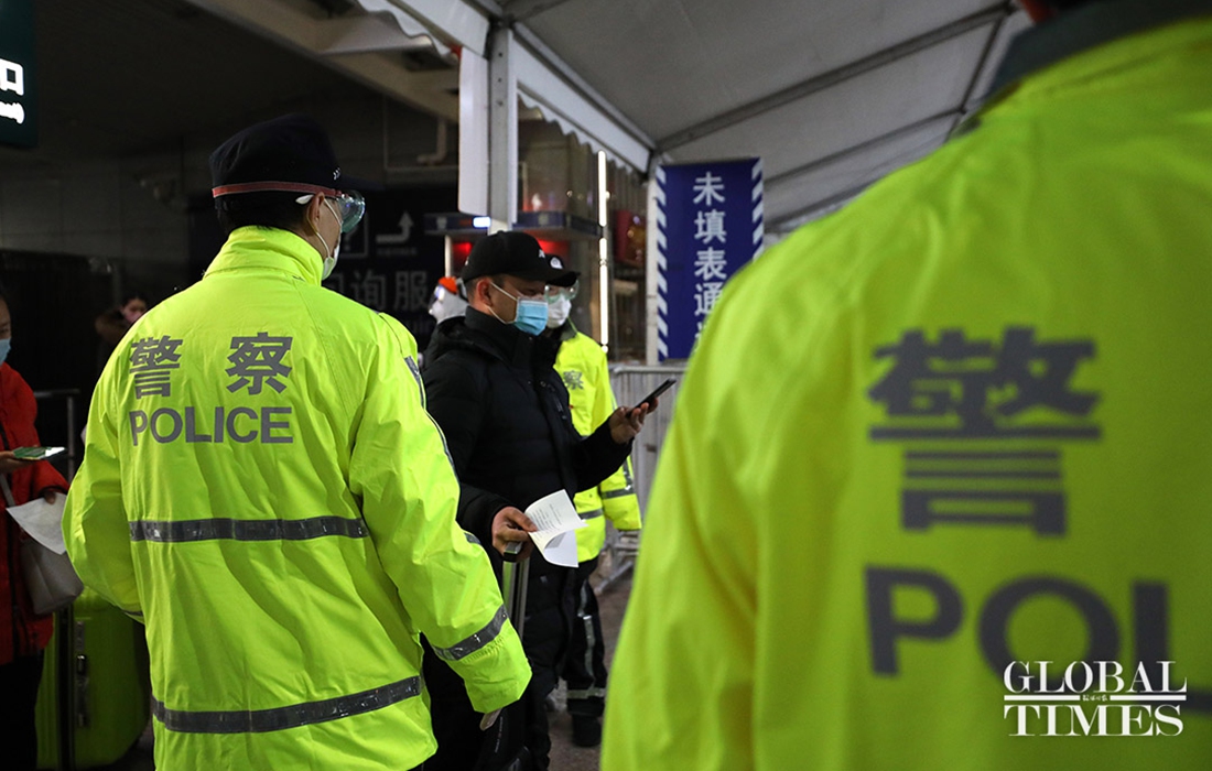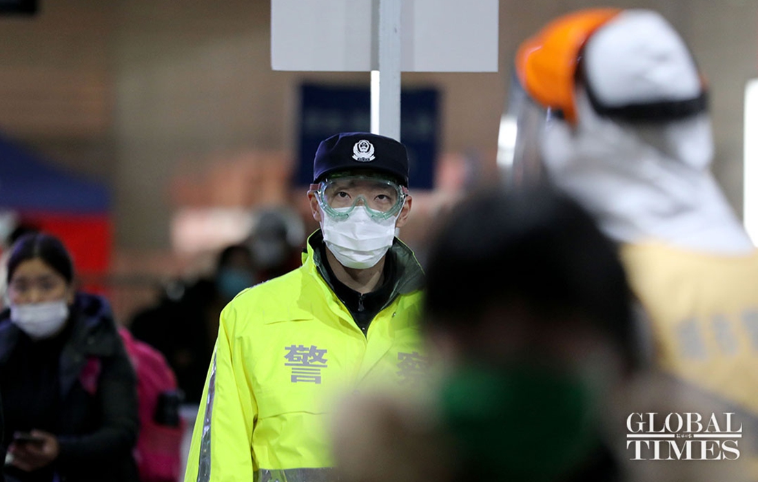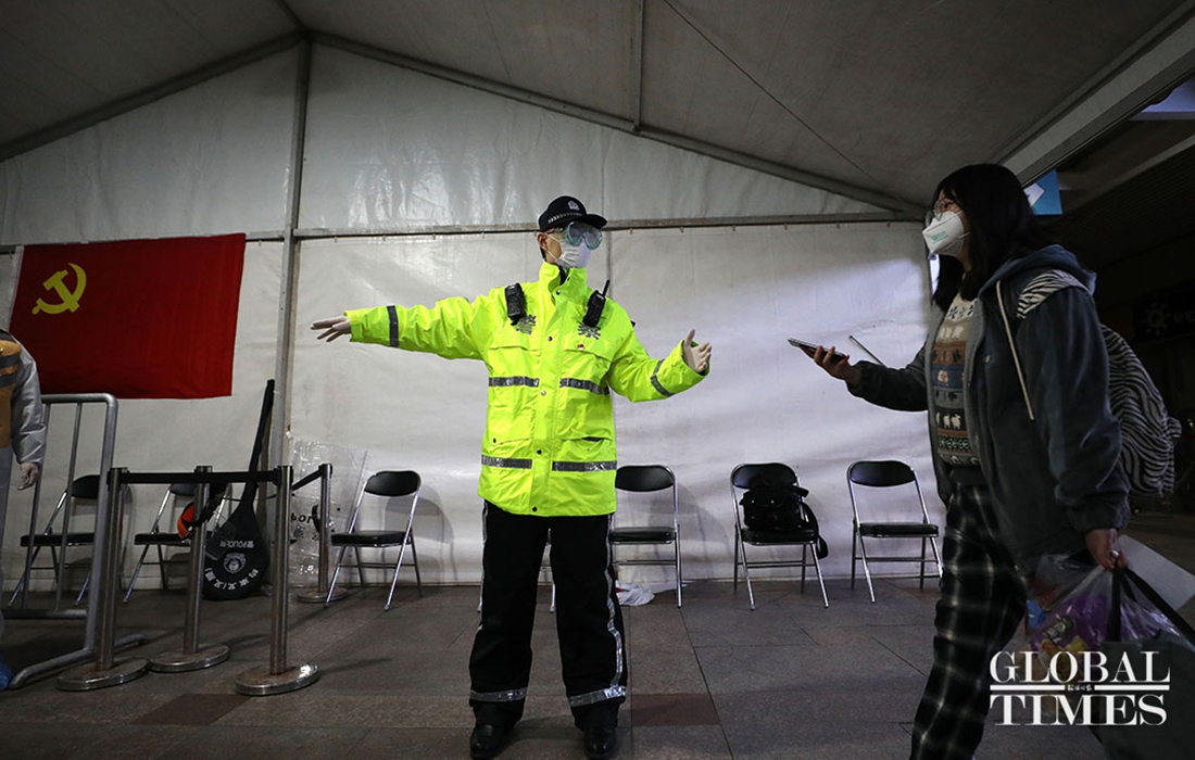 A group of police officers from the Shanghai Jing'an Public Security Bureau are on duty at Shanghai Railway Station, one of the four major train stations in Shanghai, East China.Their main responsibility is to check tourists’ health status and maintain order in the railway station.After they work for 15 days straight in a shift, they will be quarantined for 14 days, which means they will not be able to see their families for nearly a month.(Photos: Yang Hui/GT)