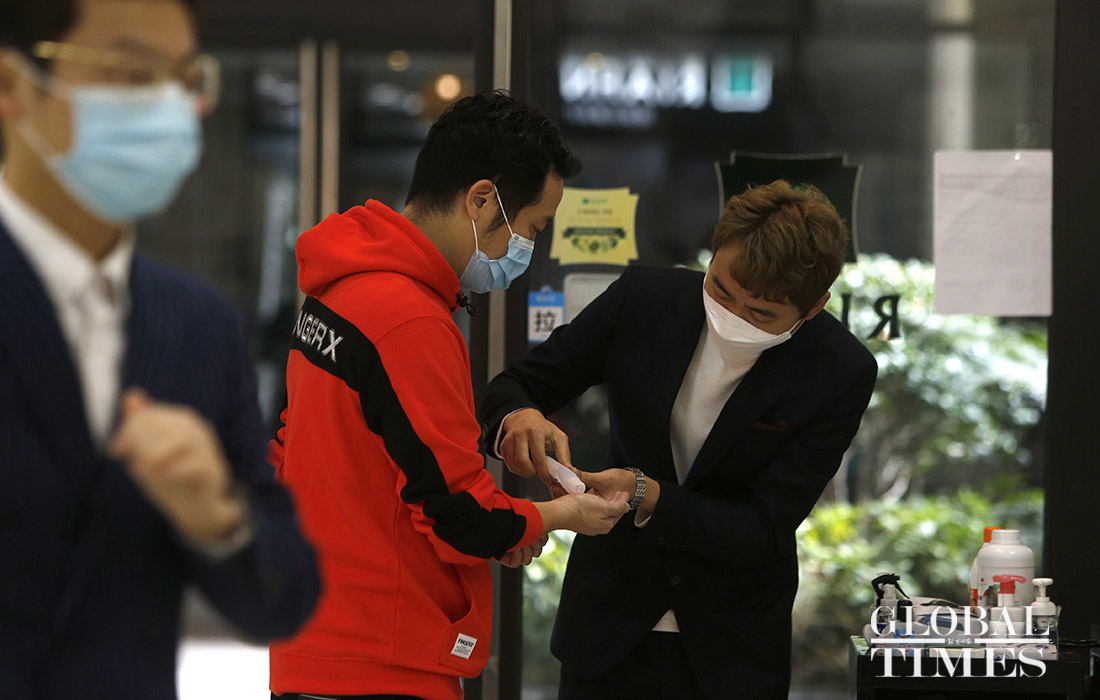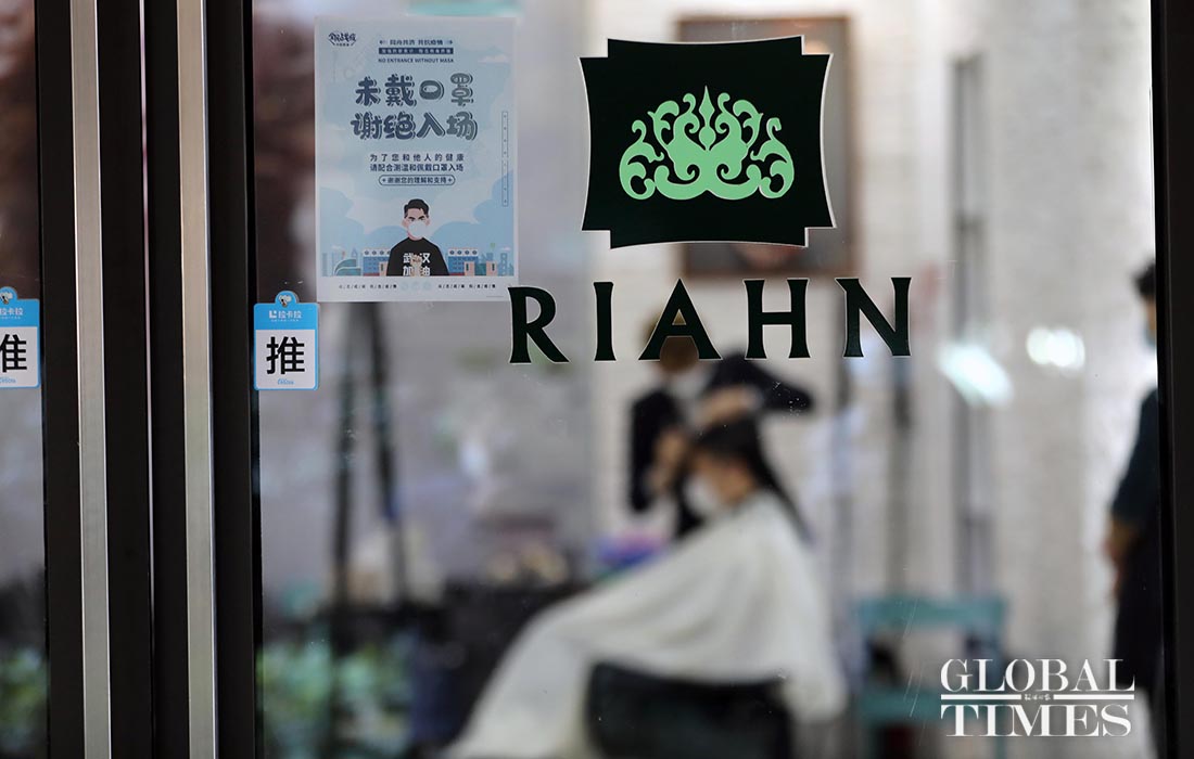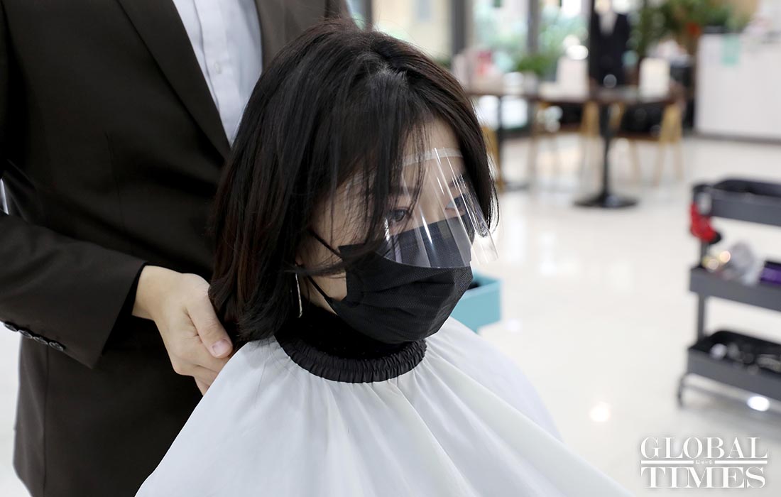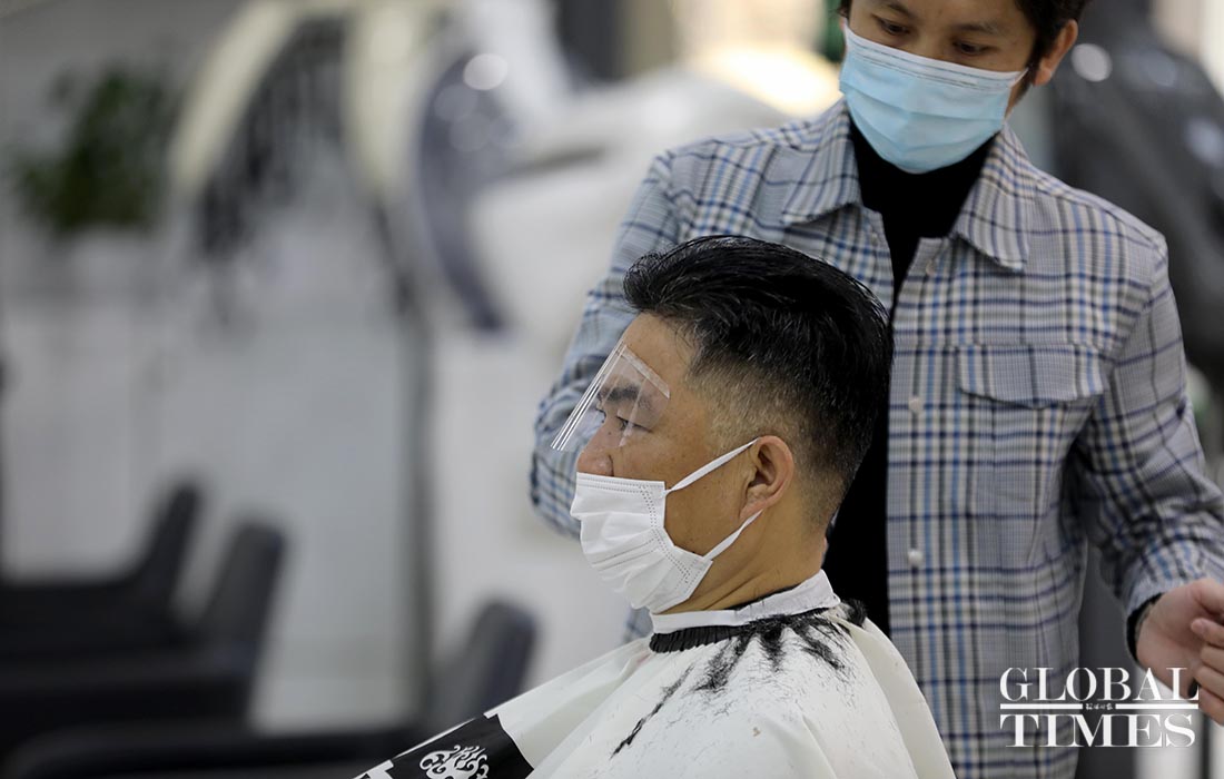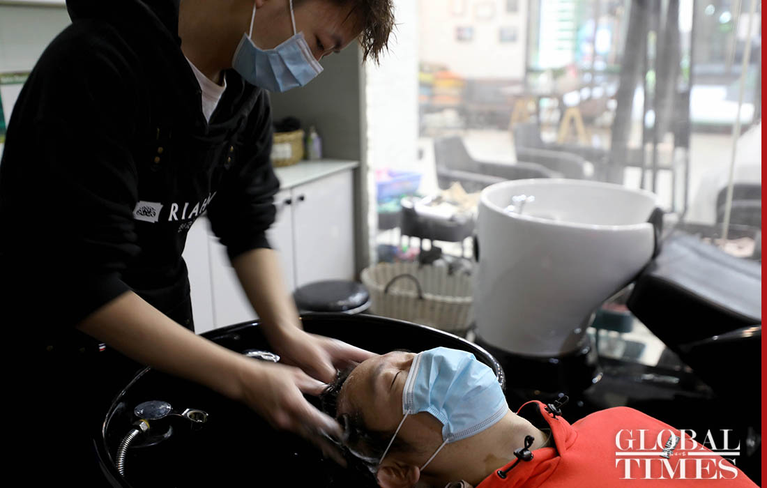 A hairdresser in Shanghai adopts a reservation system to limit the number of customers on Feb 24, the traditional Dragon Head-Raising Day, or Er Yue Er. On this day, people usually get a haircut, as it is believed to usher in good luck for the upcoming year. Amid the COVID-19 outbreak, about 20 customers wearing masks got haircuts on Monday, a sharp decrease compared to 100 plus last year on this traditional day. Customers need to go through thorough disinfection before entering the shop.Photos: Yang Hui/GT