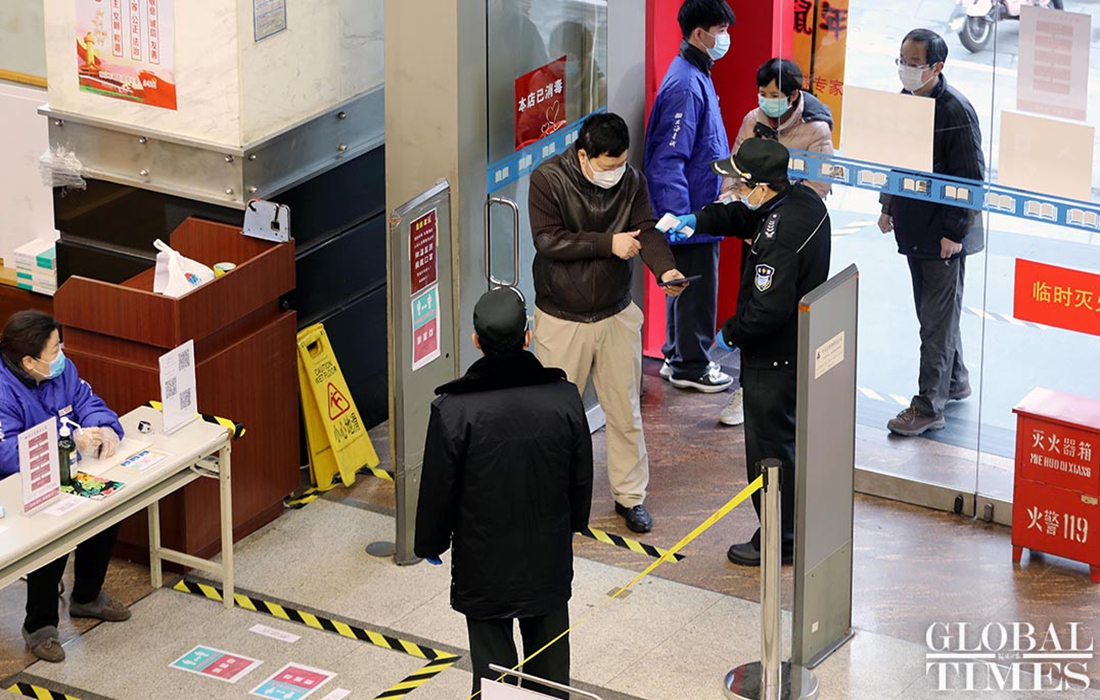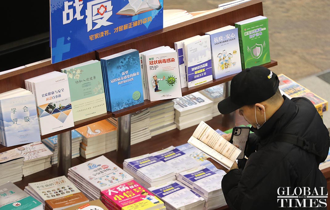 Shanghai Xinhua Bookstore reopened on Thursday with a new section by its entrance dedicated to epidemic prevention books, which was very popular among readers in store on Friday. GT reporter observed staff wearing masks and gloves while working, and found that customer traffic was just 10% of its usual level.(Photos: Yang Hui/GT)