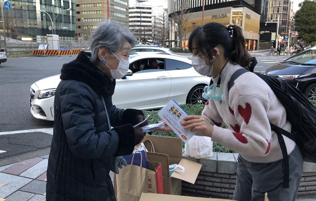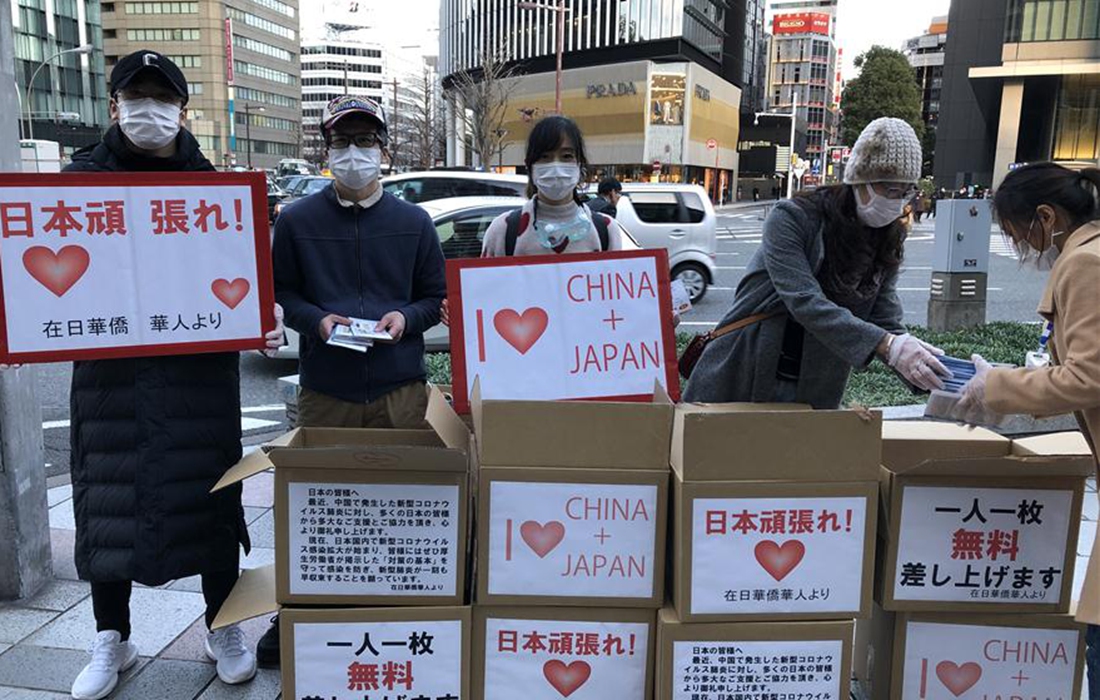 Members of a Chinese volunteer group distribute masks to local people in Nagoya, Japan, Feb. 20, 2020. Some Chinese people in Japan have acted to raise masks and distribute them to Japanese people to help with prevention of the novel coronavirus disease. Photo:Xinhua figcaption >