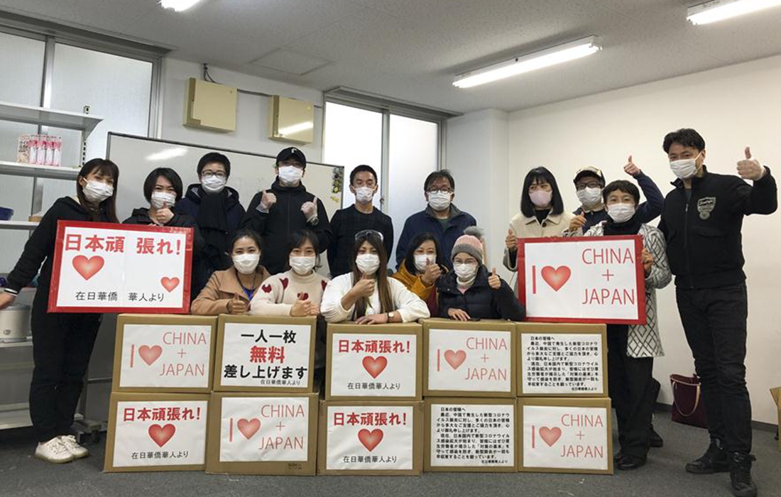 Members of a Chinese volunteer group pose for group photos before setting out to distribute masks to local people in Nagoya, Japan, Feb. 20, 2020. Some Chinese people in Japan have acted to raise masks and distribute them to Japanese people to help with prevention of the novel coronavirus disease.Photo:Xinhua figcaption >
