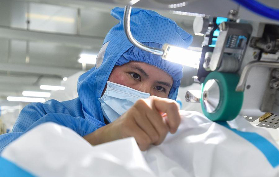 A worker makes protective suits at the workshop of Foshan Nanhai Plus Medical Co., Ltd. in Foshan, south China's Guangdong Province, March 3, 2020. Photo: Xinhua figcaption >