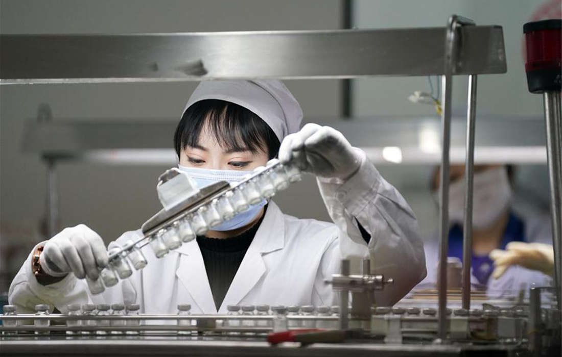 Workers are busy on the production line of Cefaleolin sodium for injection in the Harbin Pharmaceutical Group General Pharmaceutical Factory in Harbin, northeast China's Heilongjiang Province, March 2, 2020. Photo: Xinhua figcaption >