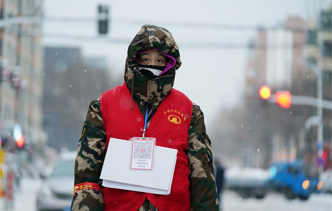 Volunteer Li Wenqi stands in the snow at a checking point for epidemic prevention in Harbin, northeast China's Heilongjiang Province, Feb 29, 2020. Photo: Xinhua figcaption >
