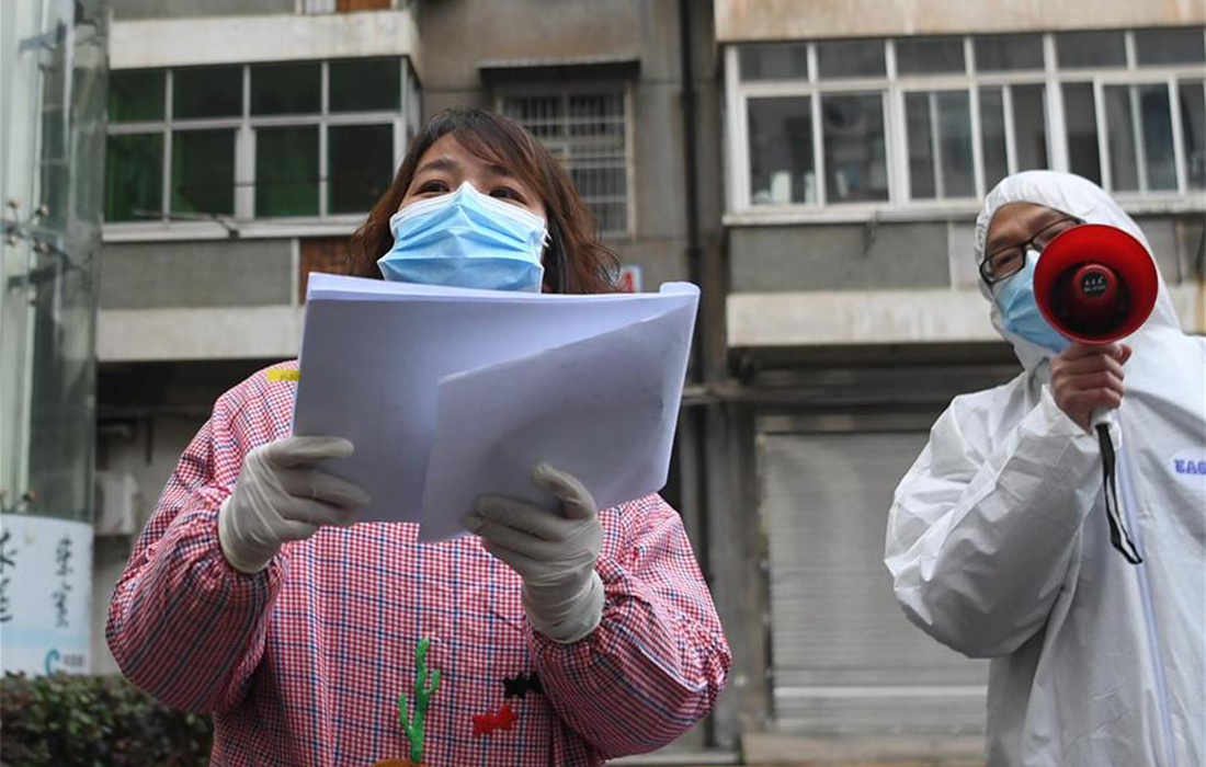 Community workers learn about residents' situation in Caidian District of Wuhan, central China's Hubei Province, Feb 7, 2020. Photo: Xinhua figcaption >