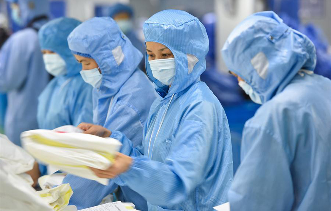 Workers package protective suits at the workshop of Foshan Nanhai Plus Medical Co., Ltd. in Foshan, south China's Guangdong Province, March 3, 2020. Photo: Xinhua figcaption >