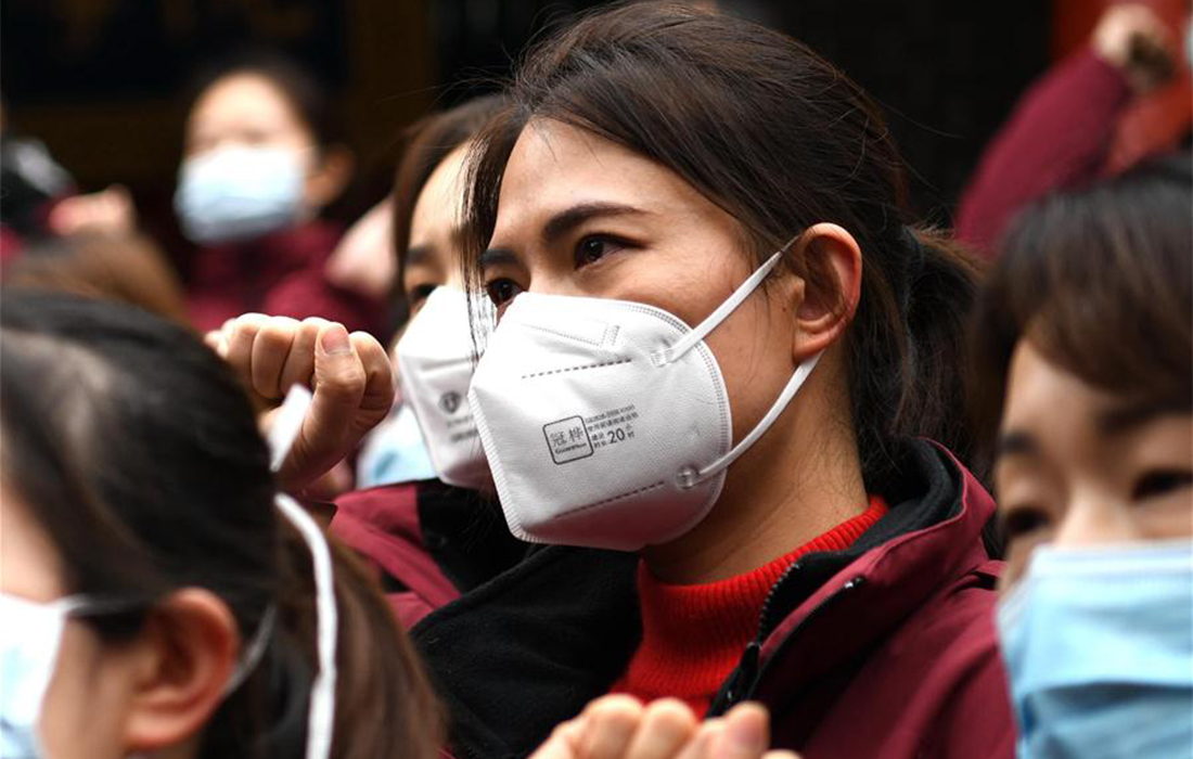 Medical team members take an oath before leaving for Hubei Province at West China Hospital of Sichuan University in Chengdu, capital of southwest China's Sichuan Province, Feb 7, 2020. Photo: Xinhua figcaption >