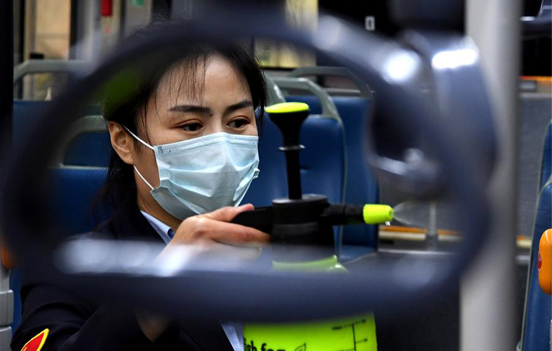 Huang Fei disinfects the bus before starting a day's work in Zhengzhou, central China's Henan Province, Feb 24, 2020. Huang Fei, a bus driver born in 1986, conducts a variety of measures to safely facilitate the travel of people during the epidemic control period. Photo: Xinhua figcaption >