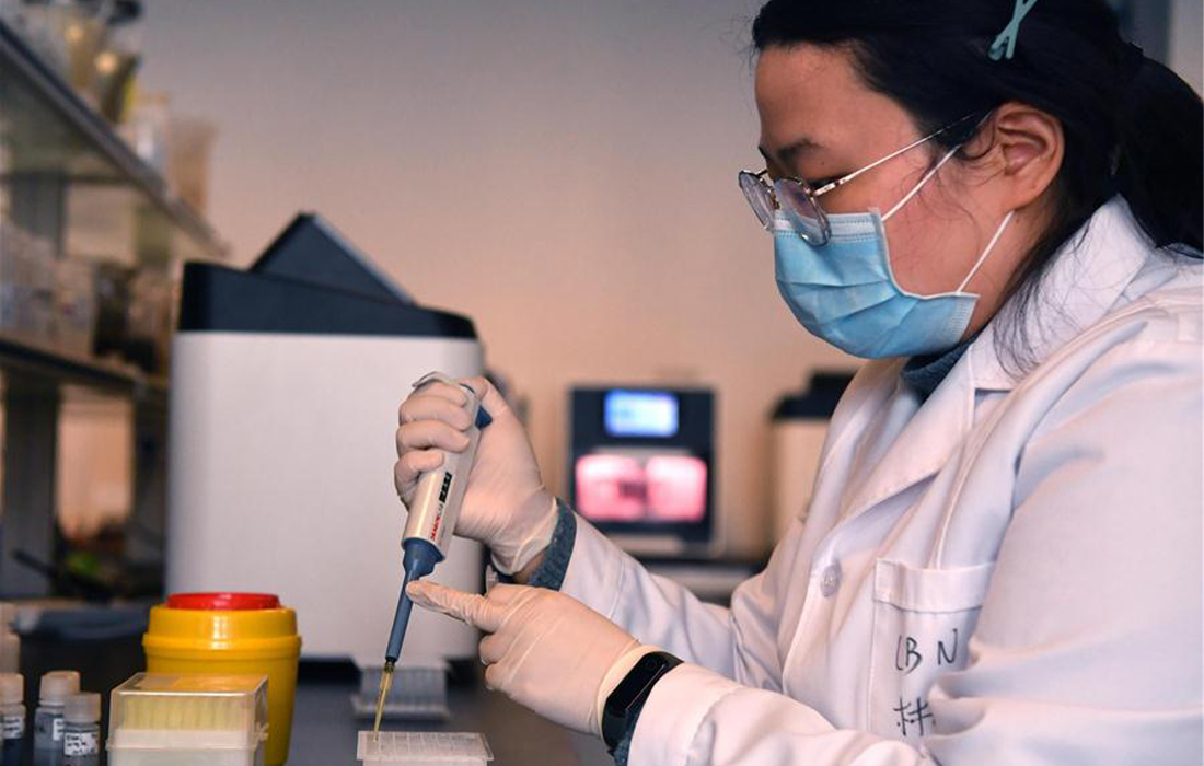 A staff checks the nucleic acid test kit at the plant of Luoyang Ascend Biotechnology Co., Ltd in Luoyang, central China's Henan Province, March 4, 2020. Photo: Xinhua figcaption >