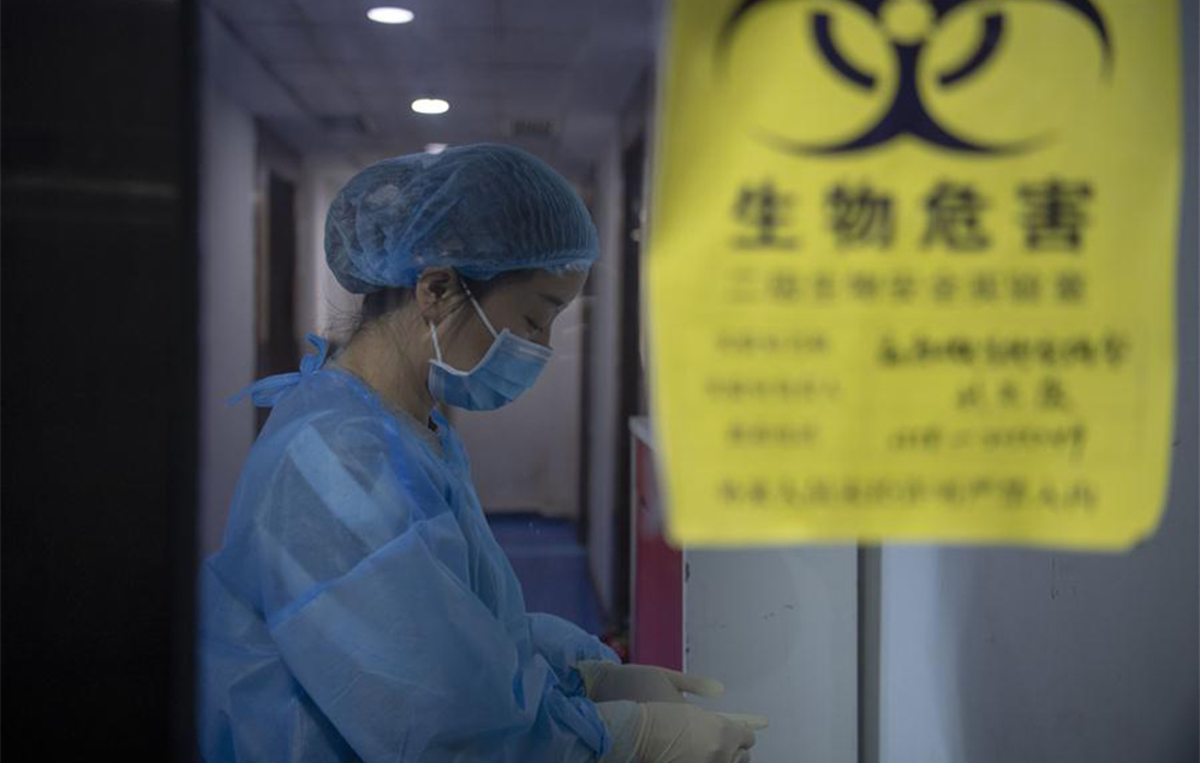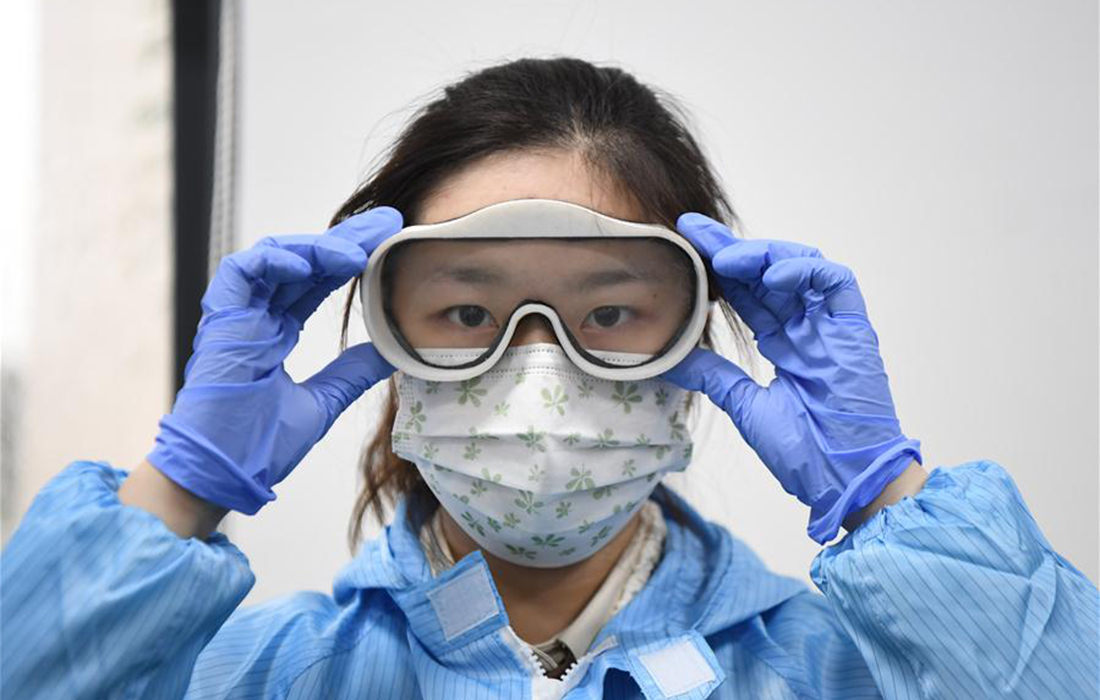 Zhang Huibian, a staff member of the Center for Disease Control and Prevention of Lyuliang, puts on protective suit outside a laboratory in Lyuliang, north China's Shanxi Province, March 3, 2020. Photo: Xinhua figcaption >