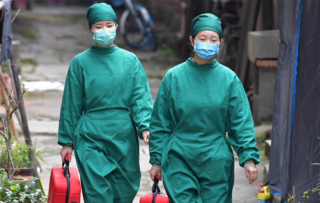 Doctor Hu Xiaoling (R) with her colleague delivers medicines to a household in Nanchang, east China's Jiangxi Province, Feb 26, 2020. Photo: Xinhua figcaption >