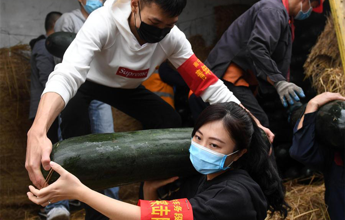 Railway workers carry supplies to be transported to Hubei Province at the international railway port in Nanning, south China's Guangxi Zhuang Autonomous Region, March 3, 2020. Photo: Xinhua figcaption >