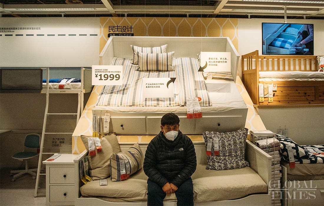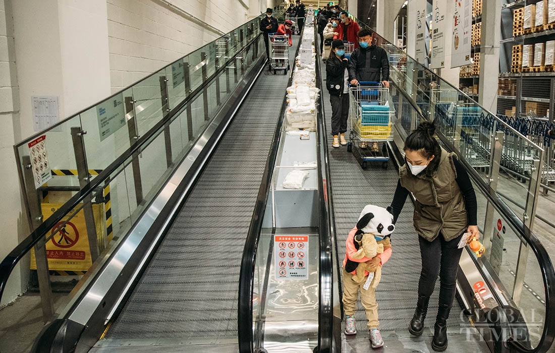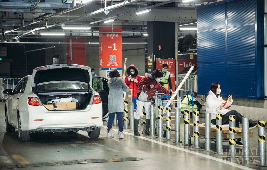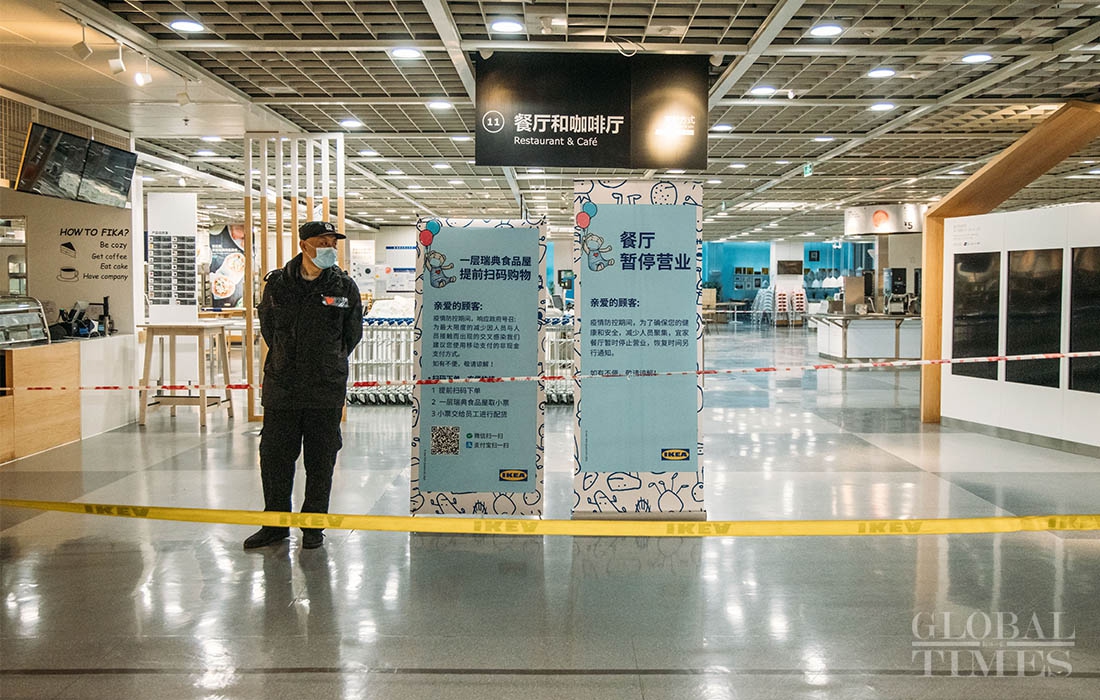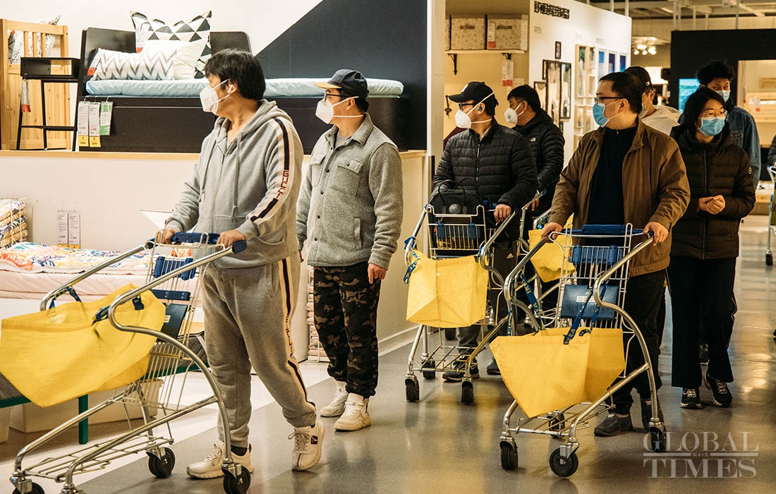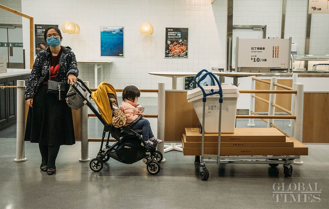 The IKEA store in Daxing district, Beijing, resumes work on Mar 8, International Women's Day. Shoppers are required to take their temperatures at the entrance of the parking lot and scan the code to register their personal information before entering the store. Restaurants and children's playgrounds have been closed to avoid crowds. Photos: Li Hao/GT
